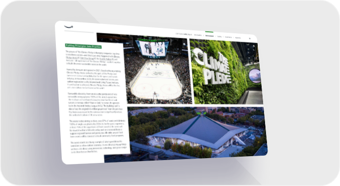 Putting Principles Into Practice The power of The Climate Pledge is bringing companies together to accelerate action—and that’s just what happened with Climate Pledge Arena . Oak View Group , the Seattle Kraken , and Amazon—all signatories of The Climate Pledge—worked together to build the most sustainable arena in the world. Named by Amazon and opened in 2021, Seattle’s history-making Climate Pledge Arena embodies the spirit of the Pledge and aims to set a new sustainability bar for the sports and events industry. In November 2020, the arena submitted its net-zero carbon registration to the International Living Future Institute. If certification is achieved, Climate Pledge Arena will be the first net-zero carbon certified arena in the world. Renewable electricity from on-site solar panels and off-site renewable energy powers 100% of the arena’s operations. The stadium uses reclaimed rainwater stored in the ice rink system, a concept called “Rain to Rink,” to create the greenest ice in the National Hockey League (NHL). The building itself is also a feat; the original 44-million-pound roof from the previous Key Arena was reused in the construction to significantly reduce the embodied carbon of the new arena. The arena is also aiming to divert over 97% of waste and eliminate 100% of single-use plastics by 2024. As for the guest experience, at least 75% of the ingredients of food served in the arena will be sourced within a 300-mile radius and on a seasonal basis to support regional farmers and producers. All viable unused food from events will be donated to local community food programs. The arena stands as a living example of what’s possible in the transition to a low-carbon economy. It’s not about giving up things we love—it’s about using innovation, technology, and great design to do them better than before. 2021 Sustainability Report Introduction I Environment I Society I Governance I Appendix 15
