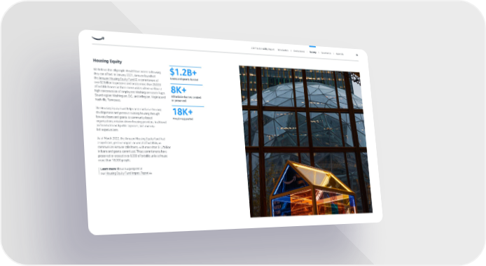 Housing Equity We believe that all people should have access to housing they can afford. In January 2021, Amazon launched the Amazon Housing Equity Fund , a commitment of over $2 billion to preserve and create more than 20,000 affordable homes in three communities where we have a high concentration of employees: Washington state’s Puget Sound region; Washington, D.C., and Arlington, Virginia; and Nashville, Tennessee. The Housing Equity Fund helps create inclusive housing developments and preserve existing housing through low-rate loans and grants to community-based organizations, mission-driven housing providers, traditional and nontraditional public agencies, and minority- led organizations. As of March 2022, the Amazon Housing Equity Fund had a significant, positive impact on rental affordability in communities Amazon calls home, with more than $1.2 billion in loans and grants committed. These commitments have preserved or created over 8,000 affordable units to house more than 18,000 people. $1.2B+ Loans and grants funded 8K+ Affordable homes created or preserved 18K+ People supported Learn more about our progress in our Housing Equity Fund Impact Report . 2021 Sustainability Report Introduction I Environment I Society I Governance I Appendix 73