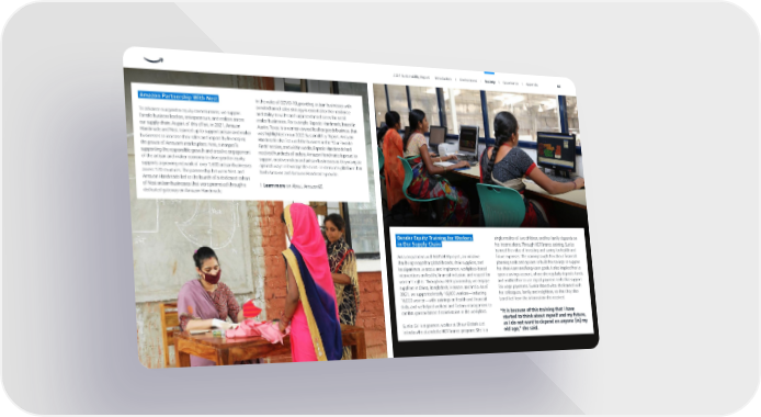 Amazon Partnership With Nest To advance our gender equity commitments, we support female business leaders, entrepreneurs, and makers across our supply chain. As part of this effort, in 2021, Amazon Handmade and Nest teamed up to support artisan and maker businesses to increase their sales and impact by leveraging the power of Amazon’s marketplace. Nest, a nonprofit supporting the responsible growth and creative engagement of the artisan and maker economy to drive gender equity, supports a growing network of over 1,600 artisan businesses across 120 countries. The partnership between Nest and Amazon Handmade led to the launch of a dedicated cohort of Nest artisan businesses that were promoted through a dedicated gateway on Amazon Handmade. In the wake of COVID-19, providing artisan businesses with a multichannel sales strategy is essential to their resilience and ability to withstand unprecedented times for small maker businesses. For example, Espacio Handmade, based in Austin, Texas, is a women-owned leather goods business that was highlighted in our 2020 Sustainability Report. Amazon Handmade also featured the business in the “Our Favorite Finds” section, and within weeks, Espacio Handmade had received hundreds of orders. Amazon Handmade is proud to support creative maker and artisan businesses as they navigate optimal ways to leverage the direct-to-consumer platform that both Amazon and Amazon Handmade provide. Gender Equity Training for Workers in Our Supply Chain Amazon partners with BSR’s HERproject, an initiative that brings together global brands, their suppliers, and local partners to create and implement workplace-based interventions on health, financial inclusion, and respect for women’s rights. Through our BSR partnership, we engage suppliers in China, Bangladesh, Vietnam, and India. As of 2021, we supported nearly 16,000 workers—including 10,000 women—with trainings on health and financial skills, and we helped workers and factory management to combat gender-based discrimination in the workplace. Sunita Giri is a garment worker at Dhruv Globals Ltd. in India who attended a HERfinance program. She is a single mother of two children, and her family depends on her income alone. Through HERfinance training, Sunita learned the value of investing and saving for health and future expenses. The training taught her about financial planning tools and options to build her savings to support her short-term and long-term goals. It also inspired her to open a savings account, where she regularly deposits funds, and enabled her to use digital payment tools that support fair wage payments. Sunita shared what she learned with her colleagues, family, and neighbors, so that they also benefited from the information she received. “It is because of this training that I have started to think about myself and my future, as I do not want to depend on anyone [in] my old age,” she said. Learn more on About Amazon . 2021 Sustainability Report Introduction I Environment I Society I Governance I Appendix 64