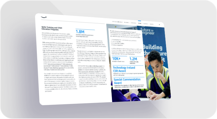 The AWS Infrastructure Community Engagement Program (AWS InCommunities) forges local relationships and creates community- focused programs where AWS builds, operates, and is expanding our physical infrastructure. AWS InCommunities focuses on four key pillars: 1. STEM/STEAM (STEM + arts) education, equity, and access 2. Local tech upskilling 3. Environmental stewardship 4. Employee engagement In addition, AWS InCommunities’ Signature Programs use AWS’ unique resources to develop or inspire future builders from underrepresented and underserved communities. These include Girls’ Tech Day, AWS Tech Week, Family Tech Series, and Think Big Space. Skills Training and STEM Education Programs Amazon believes in the power of education to unlock human potential, which is why we are investing in a range of subjects and tools to help children, higher education students, and adults tap into their potential. Skills training and STEM education can have a big impact in an increasingly digitized, technological world, and we are helping people pursue careers of the future through computer science and coding skills. In 2020, we pledged to help 29 million people around the world grow their technical skills with free cloud computing skills training by 2025. To support this commitment, we have a number of initiatives, ranging from equipping higher education institutions with a free, ready-to-teach cloud curriculum to helping teachers bring coding classes to rural areas, and inspiring girls and young women to pursue careers in tech. Our programs include Amazon Future Engineer , AWS Training and Certification , AWS re/Start , AWS Academy , AWS Educate , AWS Think Big Experience , our partnership with Girls in Tech , and AWS GetIT . For example, Amazon Future Engineer is our global childhood-to-career computer science program created to inspire and educate thousands of students each year from underserved and underrepresented communities. As part of this program, students explore computer science by meeting actual Amazon employees in virtual live career talks or explorations of our real-world innovations. In 2021, Amazon Future Engineer reached 1.8 million students, and it is now available in the U.S., the UK, India, France, Germany, and Canada. Amazon Future Engineer also awards 250 students in the U.S. each year with $40,000 scholarships and paid internships at Amazon, as well as honoring Teacher of the Year Award winners with more than $30,000 for themselves and their schools. Through Amazon Future Engineer, Amazon announced a new Advanced Placement Computer Science programming curriculum , in partnership with Code.org. Designed with equity at its core, the curriculum is intended to empower every student, regardless of their background, to envision themselves using computer science to bring their dreams to life. AWS launched a $10 million scholarship program to prepare underrepresented and underserved students globally for careers in machine learning. In addition, the AWS InCommunities Scholarship Program offers a total of $100,000 in scholarships to students from U.S. states where AWS has data center operations to support their higher education ambitions in STEM. The program is open to students enrolling in courses such as electrical and electronics engineering, computer science, artificial intelligence, biochemistry, software engineering, and physics. Since 2019, AWS has awarded 120 scholarships to students across four U.S. states. 1.8M Students reached through Amazon Future Engineer in 2021 10K+ Employee volunteer hours 1.2M Positive community interactions Technology Ireland CSR Award Received for our “Take on a Cause” program sponsoring nonprofits and community groups Special Commendation Award Received from the Federation of Indian Chambers of Commerce & Industry for our contributions to COVID-19 relief efforts in India 2021 Sustainability Report Introduction I Environment I Society I Governance I Appendix 72