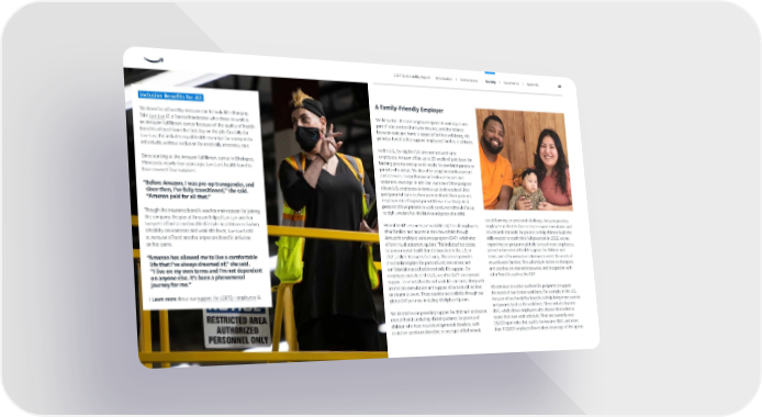 A Family-Friendly Employer We know that the time employees spend at work is just one part of what makes them who they are, and that balance between work and home is essential for their well-being. We prioritize benefits that support employees’ families of all kinds. In the U.S., for eligible full-time and reduced-time employees, Amazon offers up to 20 weeks of paid leave for birthing parents and up to six weeks for non-birth parents or parents who adopt. We also offer adoption reimbursement and access to comprehensive infertility resources and treatment coverage. In addition, our Leave Share program allows U.S. employees to donate up to six weeks of their paid parental leave to their partner should their partner’s employer not offer paid parental leave. Our Ramp Back program allows parents to work a reduced schedule for up to eight weeks after the birth or adoption of a child. Mental health resources are available 24/7 to all employees, their families, and anyone in their household through Amazon’s employee assistance program (EAP), which also offers virtual treatment options. This includes free access to a new mental health benefit launched in the U.S. in 2021, called Resources for Living. This service provides a streamlined place for personalized, convenient, and confidential mental health and daily life support. For employees outside of the U.S., we offer 24/7, on-demand support for mental health and work-life concerns, along with immediate consultation and support after a critical incident or traumatic event. These services are available through our global EAP partners, including Workplace Options. We also believe in providing support for child and adolescent mental health, including clinical guidance for parents of children who have neurodevelopmental disorders, such as autism spectrum disorders, or any type of behavioral, social, learning, or emotional challenge. Amazon provides employees in the U.S. free access to expert consultants and educational materials for parents to help children build the skills needed to reach their full potential. In 2022, we are expanding our programs globally to reach more employees, provide more mental health support for children and teens, and offer innovative solutions to meet the needs of neurodiverse families. This will include access to therapists and coaches, on-demand resources, and integration with other benefits such as the EAP. We continue to evolve our benefits programs to support the needs of our diverse workforce. For example, in the U.S., Amazon offers FamilyFlex benefits to help bring more women and parents back to the workforce. These include Anytime Shift, which allows employees who choose these roles to create their own work schedule. There are currently over 23,000 open roles that qualify for Anytime Shift, and more than 100,000 employees have taken advantage of this option. Inclusive Benefits for All The benefits offered by Amazon can be truly life-changing. Take Luv-Luv , a former hairdresser who chose to work at an Amazon fulfillment center because of the quality of health benefits offered from the first day on the job. Crucially for Luv-Luv, this includes equal health coverage for transgender individuals, without exclusion for medically necessary care. Since starting at the Amazon fulfillment center in Shakopee, Minnesota, nearly four years ago, Luv-Luv’s health benefits have covered four surgeries. “Before Amazon, I was pre-op transgender, and since then, I’ve fully transitioned,” she said. “Amazon paid for all that.” Though the insurance benefit was her main reason for joining the company, the pay at Amazon helped Luv-Luv and her two pets afford a comfortable lifestyle. In addition to finding a healthy environment and work she loves, Luv-Luv’s role at Amazon offered another important benefit: inclusion, on her terms. “Amazon has allowed me to live a comfortable life that I’ve always dreamed of,” she said. “I live on my own terms and I’m not dependent on anyone else. It’s been a phenomenal journey for me.” Learn more about our support for LGBTQ+ employees . 2021 Sustainability Report Introduction I Environment I Society I Governance I Appendix 48