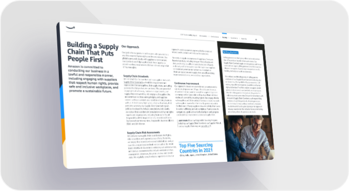 Building a Supply Chain That Puts People First Amazon is committed to conducting our business in a lawful and responsible manner, including engaging with suppliers that respect human rights, provide safe and inclusive workplaces, and promote a sustainable future. Our Approach Our goal is for our products and services to be provided in a way that respects human rights and the environment. Our global teams work closely with suppliers to communicate our standards and help suppliers build their capacity to provide working environments that are safe and respectful of human rights. Supply Chain Standards We set a high bar for ourselves and our suppliers. Amazon’s Supply Chain Standards detail the requirements and expectations for our suppliers, their supply chains, and selling partners that list products in our stores. They are grounded in principles of inclusivity, continuous improvement, and supply chain accountability. We engage with suppliers that are committed to these same principles, and suppliers commit to these standards as a condition of doing business with us. At least every three years, in line with industry best practices, we review our Supply Chain Standards against policies developed by industry associations. Additionally, we review these standards in consultation with human rights experts and organizations, including Business for Social Responsibility (BSR), Impactt Limited, International Center for Research on Women, Nest, Responsible Business Alliance (RBA), and UN Women. Supply Chain Risk Assessments We evaluate our supply chain to understand the highest risks to workers and to prioritize our efforts. To do this, we engage key internal and external stakeholders, analyze our risks using international risk indices such as the World Bank’s Worldwide Governance Indicators, run worker surveys, and conduct assessments that include worker interviews, management interviews, document reviews, and on-site visits. We regularly consult industry experts to review our approach to risk assessment against globally recognized international standards and industry best practices. We conduct regular assessments of suppliers of Amazon- branded products, including Amazon Private Brands and Amazon devices, as well as a curated selection of brands exclusively sold in Amazon’s store. We expect our suppliers to consistently monitor and enforce our standards in their own operations and supply chain, as well as making improvements to meet or exceed our expectations. Continuous Improvement Our approach is based on a commitment to workers and to continuous improvement. We put the safety and interests of workers first and work to strengthen suppliers’ capacities to manage and mitigate risks in their value chains. We have dedicated teams in key sourcing regions that engage directly with suppliers and their workers. If an issue is found, we work with suppliers to remediate the issue by prioritizing worker feedback and offering suppliers resources to help them invest in worker well-being and safe workplaces. Teams across the company set goals with senior leadership to track progress and incentivize improvement across our supply chain. Top Five Sourcing Countries in 2021 China, India, Japan, United Kingdom, United States Learn more about our Responsible Sourcing Program, including our Supply Chain Standards, our Supplier Manual, and our supply chain map, on our website . Selling Partners Selling partners are third-party sellers and retail vendors that offer products for sale in Amazon’s stores. Our Supply Chain Standards apply to every product sold in our stores and we expect selling partners to do their own due diligence in support of producing every product in safe, healthy, and inclusive work environments. We evaluate credible allegations of selling partner violations of our Supply Chain Standards including, but not limited to, those published by governments, civil society, reputable investigators, journalists, or human rights defenders. If we have reason to suspect certain products do not meet our standards, we may request that the selling partner demonstrate the products it sells in our store were manufactured in accordance with Amazon’s Supply Chain Standards, such as providing evidence of auditing protocols, showing processes for assessing factory working conditions, engaging in unannounced audits, participating in an approved industry association that includes factory monitoring, or verifying where the products are made. 2021 Sustainability Report Introduction I Environment I Society I Governance I Appendix 61