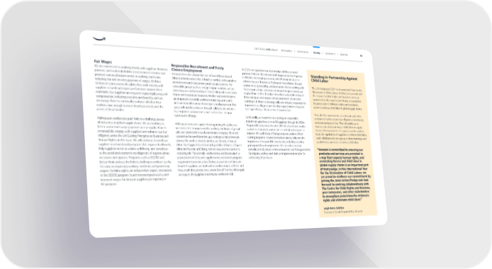 Responsible Recruitment and Freely Chosen Employment Amazon does not tolerate the use of forced labor. Forced labor is a hidden crime that is hard to combat, and workplace environments and recruitment practices are dynamic. For vulnerable groups such as foreign migrant workers, we are increasing our understanding of forced labor risk across both home and destination countries. Worker voice mechanisms are important to enable workers to raise issues in a safe and confidential manner. We recognize real progress in this space will only be achieved through collaborative action— by companies, governments, and civil society—to spur systemwide change. With operations and supply chains spanning the globe, we are committed to improving the working conditions of people who are connected to our business and recognize the need to monitor for conditions that put workers at risk of modern slavery. We work to identify and reduce the risk of forced labor. Our Supply Chain Standards prohibit all forms of forced labor and human trafficking, and set requirements aimed at reducing risk. For example, workers must not be required to pay recruitment fees, and suppliers must not retain passports or personal documentation. During assessments of Amazon- branded suppliers, we track where workers migrated from and how much they paid in recruitment fees. If fees have been paid, we require the supplier to reimburse workers in full. In 2021, we expanded our relationships with key external partners RBA and the International Organization for Migration (IOM). We also began partnering with the Issara Institute to address issues of human trafficking and forced labor through worker voice, partnership, and innovation. We are working with these organizations to better understand hotspots across our supply chain so that the rights of workers vulnerable to forced labor continue to be respected and promoted. We are also working with them to leverage collective industry responses for improved due diligence and develop impactful risk mitigation strategies that put the interests of workers first. Additionally, we expanded our training on responsible recruitment practices to over 50 suppliers through the RBA’s Responsible Labor Initiative and IOM. We also offered worker awareness training to workers at sites in high-risk regions to improve the well-being of foreign migrant workers. These training programs focused on modern slavery risks and the importance of responsible recruitment, including teaching participants how to implement effective risk mitigation controls, identify issues in their recruitment and hiring processes for migrant workers, and draft an implementation plan for addressing these issues. Standing in Partnership Against Child Labor The UN designated 2021 as International Year for the Elimination of Child Labour. Building on our work with The Centre for Child Rights and Business, Amazon committed to the Joint Action Pledge to strengthen the protection of children’s rights and accelerate action to address child labor in global supply chains. Through this commitment, we will work with other retailers to further extend due diligence, remediation, and monitoring activities. This will enable us to increase our understanding of child labor in supply chains, deliver programs to support juvenile workers, build the capabilities of suppliers to address child labor, work collaboratively as a group to share learnings, and establish best practices to address child labor. “ Amazon is committed to ensuring our products and services are provided in a way that respects human rights, and combating forced and child labor in global supply chains is an important part of that pledge. In this International Year for the Elimination of Child Labour, we are proud to reinforce our commitment by joining the Joint Action Pledge and look forward to working collaboratively with The Centre for Child Rights and Business, peer companies, and other stakeholders to strengthen protections for children’s rights and eliminate child labor.” Leigh Anne DeWine Director of Social Responsibility, Amazon Fair Wages We are committed to working closely with suppliers, business partners, and multistakeholder associations to monitor and promote continual improvement in working conditions, including fair and on-time payment of wages. We have dedicated teams across the globe that work directly with suppliers to track and report performance against these standards. Our suppliers are required to pay legally required compensation, including overtime and benefits, and we encourage them to continually evaluate whether their workers earn enough to meet their basic needs and the needs of their families. Making sure workers are paid fairly is a challenge across all industries in global supply chains. We are working to better understand wage payments in our supply chain to meaningfully engage with suppliers and enhance our due diligence under the UN Guiding Principles on Business and Human Rights on this issue. We will continue to enroll our suppliers in international programs that improve livelihoods, help suppliers invest in worker well-being, and contribute to the social and economic development of regions where we source and operate. Programs such as SCORE and Better Work address the holistic challenges workers face by focusing on improving working conditions and promoting respect for labor rights. An independent impact assessment of the SCORE program found increased productivity and increased wages for Amazon suppliers participating in the program. 2021 Sustainability Report Introduction I Environment I Society I Governance I Appendix 65