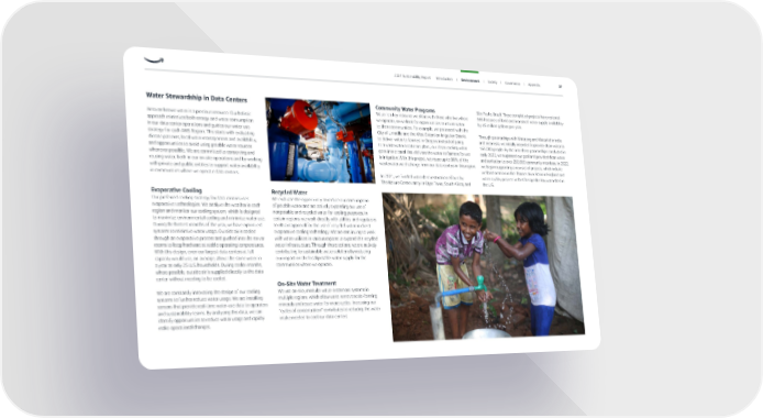 Community Water Programs Water is a key resource we share with those who live where we operate, so we look for opportunities to return water to these communities. For example, we partnered with the City of Umatilla and the West Extension Irrigation District to deliver water to farmers in Oregon. Instead of going to a wastewater treatment plant, our clean cooling water goes into a canal that delivers the water to farmers for use in irrigation. With this project, we reuse up to 96% of the wastewater we discharge from our data centers in this region. In 2021, we funded watershed restoration efforts by The Nature Conservancy in Cape Town, South Africa, and Recycled Water We evaluate the opportunity to reduce our consumption of potable water and are actively expanding our use of nonpotable and recycled water for cooling purposes. In certain regions, we work directly with utilities and regulators to obtain approval for the use of recycled water in direct evaporative cooling technology. We are continuing to work with water utilities in various regions to expand this recycled water infrastructure. Through these actions, we are actively contributing to sustainable water solutions by reducing our impact on the local potable water supply for the communities where we operate. On-Site Water Treatment We use on-site, modular water-treatment systems in multiple regions, which allow us to remove scale-forming minerals and reuse water for more cycles. Increasing our “cycles of concentration” contributes to reducing the water intake needed to cool our data centers. Water Stewardship in Data Centers Amazon knows water is a precious resource. Our holistic approach minimizes both energy and water consumption in our data center operations and guides our water use strategy for each AWS Region. This starts with evaluating climate patterns, local water management and availability, and opportunities to avoid using potable water sources whenever possible. We are committed to conserving and reusing water, both in our on-site operations and by working with private and public entities to support water availability in communities where we operate data centers. Evaporative Cooling Our preferred cooling strategy for data centers uses evaporative technologies. We analyze the weather in each region and monitor our cooling system, which is designed to maximize environmental cooling and minimize water use. During the hottest months of the year, we have optimized systems to minimize water usage. Outside air is cooled through an evaporative process and pushed into the server rooms to keep hardware at stable operating temperatures. With this design, even our largest data centers at full capacity would use, on average, about the same water in a year as only 25 U.S. households. During cooler months, where possible, outside air is supplied directly to the data center without needing to be cooled. We are constantly innovating the design of our cooling systems to further reduce water usage. We are installing sensors that provide real-time water-use data to operators and sustainability teams. By analyzing this data, we can identify opportunities to reduce water usage and rapidly make operational changes. São Paulo, Brazil. These completed projects have restored 365 hectares of land and increased water supply availability by 45 million gallons per year. Through partnerships with Water.org and WaterAid in India and Indonesia, we initially intended to provide clean water to 165,000 people. By the time these partnerships concluded in early 2022, we surpassed our goal and provided clean water and sanitation to over 250,000 community members. In 2022, we began supporting a new set of projects, which include wetland creation in the Thames River Basin in England and water quality projects in the Chesapeake Bay watershed in the U.S. 2021 Sustainability Report Introduction I Environment I Society I Governance I Appendix 37
