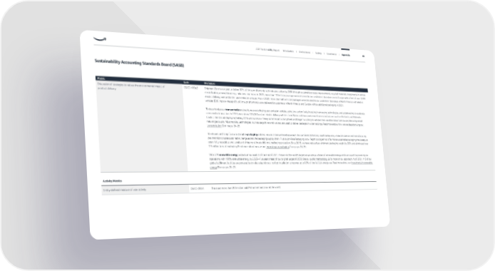 Metric Code Disclosure Discussion of strategies to reduce the environmental impact of product delivery CG-EC-410a.2 Shipment Zero is our goal to deliver 50% of Amazon shipments with net-zero carbon by 2030 through sustainable process improvements, recycled materials, investments in vehicle electrification, renewable energy initiatives, and more. In 2021, more than 100 million packages were delivered to our customers’ doorsteps across Europe with a fleet of over 3,000 electric delivery vans and other zero-emission vehicles. Also in 2021, more than half a million packages were delivered to our customers’ doorsteps in North America with electric vehicles (EVs). Approximately 8% of Amazon shipments were delivered to customers in North America and Europe without additional packaging in 2021. To decarbonize our transportation network, we are deploying zero-emission vehicles, using low-carbon fuels, investing in emerging technologies, and collaborating to accelerate cross-sector innovation. In 2019, we ordered 100,000 custom electric delivery vehicles from Rivian and thousands more from manufacturers such as Stellantis and Mahindra Electric. We started deploying battery EV trucks across our heavy commercial trucking fleets and began switching to vehicles that use alternative fuel sources, like compressed natural gas trucks. Micromobility technologies, such as cargo bikes and walkers, are used to deliver packages in urban settings. Read more about how we are decarbonizing our transportation on pages 24–25. To reinvent and simplify our sustainable packaging options, we use a science-based approach that combines lab testing, machine learning, materials science, and manufacturing partnerships to scale sustainable change across the packaging supply chain. Frustration-Free Packaging is our flagship program to offer more-sustainable packaging that is easy to open, fully recyclable, and capable of shipping without additional packaging protection. Since 2015, we have reduced per-shipment packaging weight by 38% and eliminated over 1.5 million tons of packaging. Read more about how we are improving our packaging on pages 28–29. With 274 renewable energy projects announced as of the end of 2021, Amazon is the world’s largest corporate purchaser of renewable energy and is on a path to powering our operations with 100% renewable energy by 2025—five years ahead of our original target of 2030. See our public methodology for more on our approach. As of 2021, 115 of our global fulfillment facilities are powered by on-site solar, where a rooftop installation can power up to 80% of the facility’s energy use. Read more about our investments in renewable energy on pages 20–21. Activity Metrics Entity-defined measure of user activity CG-EC-000.A There are more than 200 million paid Prime members around the world. Sustainability Accounting Standards Board (SASB) 2021 Sustainability Report Introduction I Environment I Society I Governance I Appendix 83