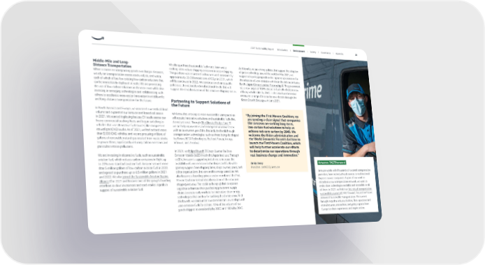 We also purchased sustainable fuel made from waste cooking oil to reduce shipping emissions in ocean shipping. This purchase was estimated to have reduced emissions by approximately 20,000 metric tons of CO 2 e in 2021, which will be continued in 2022. We continue to advance public policies at the national and multinational levels that will support the decarbonization of the maritime shipping sector. Partnering to Support Solutions of the Future We know that moving to more-sustainable transportation will require innovative solutions and sustainable fuels that do not yet exist. Through The Climate Pledge Fund , we are helping inventors and entrepreneurs move faster with an investment portfolio that includes breakthrough transportation technologies, such as those being developed by Rivian, BETA Technologies, Resilient Power, Amogy, Infinium, and ZeroAvia. In 2021, we helped launch Cargo Owners for Zero Emission Vessels (coZEV) with the Aspen Institute. Through coZEV, Amazon is supporting initiatives to increase the availability of zero-emission technologies and fuels while gaining support from shipping lines, cargo owners, ports, and other organizations that can enable energy transition. We also became a founding private sector member of the First Movers Coalition to lead decarbonization of the maritime shipping industry. The coalition brings global companies together to harness their purchasing power and supply chains to create early markets for innovative clean energy technologies that are key for tackling the climate crisis. With this launch, we announced our commitment to use ships with zero-emission fuels for at least 10% of the volume of our goods shipped internationally by 2030 and 100% by 2040. Additionally, we are driving policies that support the adoption of green technology around the world. In May 2021, we supported a policy proposal to the Japanese government for the adoption of zero-emission vehicles in the delivery industry by the Japan Climate Leaders’ Partnership . The government set a new target of 100% electric or fuel cell vehicles in new delivery vehicle sales by 2040. It also introduced intensive measures to adopt EVs over the next decade through the Green Growth Strategy in June 2021. Amazon FASTforward Amazon works with thousands of external transportation providers, from individual truck owners to multinational logistics service companies. As part of our work to decarbonize our transportation network, we want to make clean technologies available and accessible to all of them. In 2021, we held our first virtual transportation sustainability summit , FASTforward, focused on Future Advanced Sustainable Transportation. The summit brought together industry leaders, fleet operators and manufacturers, researchers, and policy experts from Europe to share experiences and inspire action. Middle-Mile and Long- Distance Transportation When it comes to transporting goods over longer distances, we rely on transportation across roads, rail, air, and water, each of which offers few existing low-carbon solutions that can be immediately deployed at scale. We are promoting the use of low-carbon solutions in the near term while also investing in emerging technologies and collaborating with others to accelerate cross-sector innovation in middle-mile and long-distance transportation for the future. In North America and Europe, we increased our total rail load volume and expanded our Amazon and leased rail assets in 2021. We started deploying battery EV trucks across our heavy commercial trucking fleets and began switching to vehicles that use alternative fuel sources, like compressed natural gas (CNG) trucks. As of 2021, we had ordered more than 3,000 CNG vehicles, and we are procuring millions of gallons of renewable natural gas created from waste stocks to power them, significantly reducing carbon emissions and particulate matter pollutants. We are investing in alternative fuels, such as sustainable aviation fuel, which reduces carbon emissions in flight up to 20% over standard aviation fuel. Amazon secured more than 5 million gallons of low-carbon aviation fuel in 2020 and agreed to purchase up to 6.5 million gallons in 2021 and 2022. We also joined the Sustainable Aviation Buyers Alliance in 2021 and became one of the group’s founding members to drive investment and send market signals in support of sustainable aviation fuel. “ By joining the First Movers Coalition, we are sending a clear signal that companies like Amazon are seeking long-term, low-carbon fuel solutions to help us achieve net-zero carbon by 2040. We welcome the Biden administration and the World Economic Forum’s decision to launch the First Movers Coalition, which will help further accelerate our efforts to decarbonize our operations through real business change and innovation.” Andy Jassy President and CEO, Amazon 2021 Sustainability Report Introduction I Environment I Society I Governance I Appendix 25
