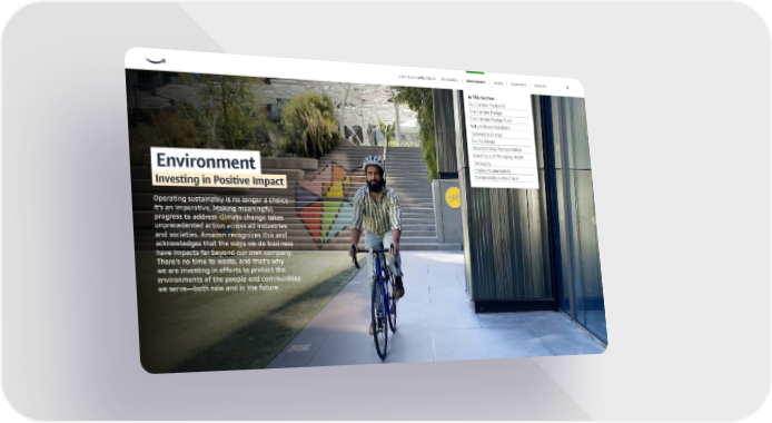 Operating sustainably is no longer a choice— it’s an imperative. Making meaningful progress to address climate change takes unprecedented action across all industries and societies. Amazon recognizes this and acknowledges that the ways we do business have impacts far beyond our own company. There’s no time to waste, and that’s why we are investing in efforts to protect the environments of the people and communities we serve—both now and in the future. Environment Investing in Positive Impact In This Section Our Carbon Footprint The Climate Pledge The Climate Pledge Fund Nature-Based Solutions Renewable Energy Our Buildings Decarbonizing Transportation Avoiding and Managing Waste Packaging Product Sustainability Sustainability in the Cloud 2021 Sustainability Report Introduction I Environment I Society I Governance I Appendix 8