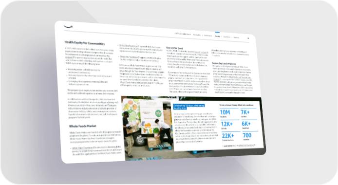 Health Equity for Communities In 2021, AWS committed $40 million over three years to help organizations develop solutions to improve health outcomes for underserved or underrepresented communities. The program is open to organizations around the world that want to harness AWS technology and expertise to advance health equity in any of the following areas: • Increasing access to health services for underserved communities • Reducing disparities by addressing social determinants of health • Leveraging data to promote more equitable and inclusive systems of care This program gives organizations another way to access AWS credits and technical expertise to advance their missions. In collaboration with local nonprofits, AWS also launched community development initiatives in villages adjoining AWS infrastructure sites in West Java, Indonesia, and Telangana, India. Initiatives include renovation of schools, provision of clean water facilities, toilets, waste management systems, hyperlocal environmental initiatives, and skill development programs for local youth. Whole Foods Market Whole Foods Market was founded with the purpose to nourish people and the planet. To make an impact in our communities, Whole Foods Market has three foundations to support strategic programs that make an impact across the globe: • Whole Planet Foundation is committed to alleviating global poverty for people living in communities in the U.S. and around the world that supply products for Whole Foods Market stores. • Whole Cities Foundation expands healthy food access and nutrition education by partnering with community-led organizations to build thriving local food systems. • Whole Kids Foundation supports schools and inspires families to improve children’s nutrition and wellness. Each quarter, Whole Foods Market supports nearly 500 community-based nonprofits with aligned missions and values through the Team Member Directed Giving program. This program is led by local team member networks and focuses on addressing specific needs within each community we serve. From October to December 2021 alone, Whole Foods Market donated more than $1.1 million to 489 nonprofits in the U.S. and Canada. Sourced for Good In 2021, Whole Foods Market launched Sourced for Good , an exclusive program dedicated to helping customers easily identify products that support workers, communities, and environmental stewardship where our products are sourced. With our Sourced for Good seal, we are committed to demystifying the decision-making process by helping our customers easily identify these products. Customers can find the Sourced for Good seal on more than 100 products in stores, including on bananas, asparagus, peppers, tomatoes, and tulips. We’ve also expanded the program to seafood as well as to domestic suppliers, as we strive to serve more communities. Purchasing Sourced for Good products directly contributes to causes that Whole Foods Market and our customers champion, including fair wages, ethical trade, improved health care access, Celebrating 10 Years of Growing Healthy Kids Ten years ago, a cash register campaign—as well as the enthusiasm of contributing team members and customers— planted a seed of an idea, which eventually grew into Whole Kids Foundation. The idea: Given the right opportunities, kids will get excited about fresh fruits, vegetables, whole grains, and other nutritious whole foods. Since its founding in 2011, Whole Kids Foundation’s community investments in the U.S., Canada, and the UK have increased access to nutritious school food and transformed the way students eat and think about food. The Foundation facilitates environments and partnerships to create lasting change. 10M Students 12K+ Schools 700 Beehives 6K+ Salad bars 7K+ Gardens 22K+ Trained teachers Learn more about the Whole Kids Foundation . 10 years of impact through Whole Kids Foundation: scholarships, planting trees, and more—with millions of dollars raised annually for hundreds of communities across 12 countries. Supporting Local Producers We support local food producers through Whole Foods Market. In addition to featuring local products in our stores, we are providing loans to small, local, independent farmers and artisanal food producers to help them expand their businesses through the Whole Foods Local Producer Loan Program . Loan recipients have included organic vegetable farmers, a heritage turkey grower, a nutritional protein bar maker, and many others. The Local Producer Loan Program has provided more than 370 loans since 2007, representing $26 million in capital, to our suppliers. In 2021 alone, more than $536,000 was awarded through six loans. 2021 Sustainability Report Introduction I Environment I Society I Governance I Appendix 70