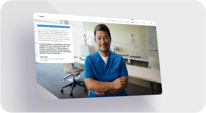 Taking a New Path—From Amazon to Medicine There is a rising demand for health workers, offering a new opportunity for more people, like Ernesto Regis . Ernesto was working in a fulfillment center in Florida when his supervisor introduced him to Amazon Career Choice. Shortly after completing a medical assistant’s course through Career Choice, Ernesto was offered a job as a medical assistant. Today, Ernesto is continuing his journey in the health care field. “ I am now working as a phlebotomist and medical assistant. But I am not done yet,” he said. “I’ve enrolled in nursing and I’m taking classes to become a registered nurse. Amazon supported and financed a better future for me. Even though that future didn’t include them.” Ernesto Regis Medical Assistant and former Amazon fulfillment center employee 2021 Sustainability Report Introduction I Environment I Society I Governance I Appendix 50