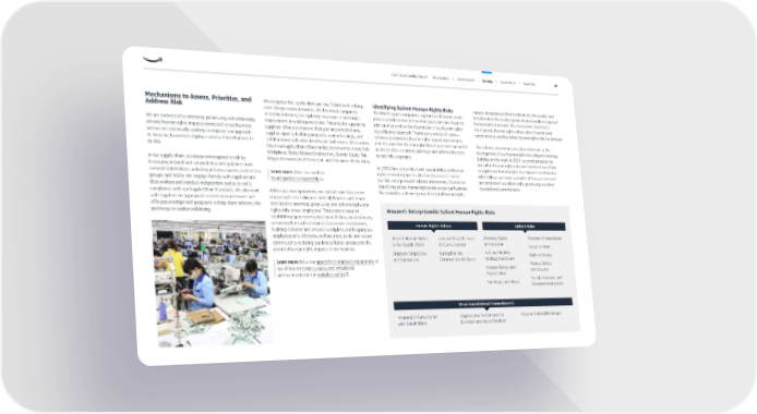 Mechanisms to Assess, Prioritize, and Address Risk We are committed to assessing, prioritizing, and addressing adverse human rights impacts connected to our business and we are continually working to improve our approach. At Amazon, businesses deploy a variety of mechanisms to do this. In our supply chain, we assess and respond to risk by leveraging internal and external data and guidance from external stakeholders, including industry experts, civil society groups, and NGOs. We engage directly with suppliers and their workers and conduct independent audits to verify compliance with our Supply Chain Standards. We also work with suppliers on appropriate remediation measures and offer partnerships and programs to help them address risks and invest in worker well-being. We recognize that audits alone are insufficient to drive long- term change across industries. We, like many companies in similar industries, are exploring new ways to encourage improvement in worker protections. This includes supporting suppliers’ efforts to improve their grievance mechanisms, supplier capacity-building programs, worker trainings, and collaborations with other brands and civil society. We currently focus our supply chain efforts on key commitment areas: Safe Workplaces, Freely Chosen Employment, Gender Equity, Fair Wages, Environmental Protection, and Grievance Mechanisms. Identifying Salient Human Rights Risks The UNGPs guide companies to prioritize the most severe risks to people connected to their operations and business relationships and are the foundation of our human rights due diligence approach. Teams use a variety of tools— saliency assessments, human rights impact assessments (HRIAs), and other human rights-based processes grounded in the UNGPs—to assess, prioritize, and address the most severe risks to people. In 2020, Amazon worked with sustainability and human rights consulting firm Article One Advisors to conduct our first enterprisewide saliency assessment, focused on identifying salient human rights risks across our business. We consulted a diverse group of external human rights experts, incorporated their feedback into the results, and benchmarked the results against internationally recognized human rights standards. The assessment identified a set of priority human rights values, three foundational commitments, and key salient human rights risks for Amazon. The saliency assessment was a key milestone in the development of our human rights due diligence strategy. Building on this work, in 2021, we made progress on our salient human rights risks and furthered our efforts to implement human rights due diligence mechanisms. What follows are some examples of how we assessed and addressed our salient risks, prioritizing our three foundational commitments. Learn more about our work to source products responsibly . Learn more about our approach to employee engagement ; our efforts on diversity, equity, and inclusion ; and our investments in workplace safety . Within our own operations, our central team focuses on human rights due diligence and collaborates with teams dedicated to assessing, prioritizing, and addressing human rights risks to our employees. These teams focus on establishing open communication with Amazon employees, providing them with meaningful grievance mechanisms, building a diverse and inclusive workplace, and keeping our employees safe. We know we have more to do, and we are committed to widening our lens to better understand the potential human rights impacts of our business. Meaningful Consultation with Stakeholders Opportunity for Concerns to be Heard and Issues Resolved Focus on Vulnerable Groups Diversity, Equity, and Inclusion Safe and Healthy Working Conditions Modern Slavery and Forced Labor Fair Wages and Hours Freedom of Association Future of Work Right to Privacy Product Safety and Security Social, Economic, and Environmental Justice Human Rights Values Salient Risks Three Foundational Commitments Amazon’s Enterprisewide Salient Human Rights Risks Respect Human Rights in Our Supply Chain Empower Employees and Contractors Earn and Keep the Trust of Our Customers Strengthen the Communities We Serve 2021 Sustainability Report Introduction I Environment I Society I Governance I Appendix 42