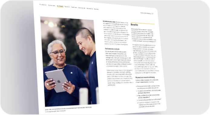 Rotational programs: We also have a number of programs for new graduates to learn through a combination of training and on-the-job work experience. Over a two-year period, participants rotate through multiple teams to gain a breadth of experience and exposure to various projects to help discover their strengths and passion. Upon successful completion of the program, participants will often transition into a non-rotating role within Apple. Our Services, Finance, Operations, and AI/ML functions all offer these types of programs. Performance reviews Our annual performance review process offers team members the opportunity to have meaningful conversations with their managers about their performance, growth, and development. Across Apple, employees receive an annual performance review, and retail team members are supported by monthly performance conversations to align on their progress. Performance reviews focus on three categories: teamwork, innovation, and results, and they include a self-assessment and feedback from peers and the team member’s manager. The performance review is also a chance to reflect on the contribution each person makes to Apple’s long-standing commitment to inclusion and diversity. Benefits We recognize that our people thrive when they have the resources to meet their needs and the time and support to succeed in their professional and personal lives. We provide a host of benefits for corporate and retail employees to help our teams live healthier, more fulfilled, and happier lives at work and beyond. 15 We regularly review and update the benefits that we offer in order to respond to our employees’ changing needs. For example, we recently expanded family care services and mental health benefits, including 15 free counseling sessions through our Employee Assistance Program, to help employees care for themselves and their loved ones through the pandemic. And in the U.S., we now offer part-time team members new vacation and sick leave days, New Parent Leave, Gradual Return to Work, Paid Family Care, and Emergency Backup Care, and in 2022, we enhanced sick leave benefits and a new accelerated vacation accrual schedule for full-time employees in our U.S. Apple Store locations. Physical and mental well-being Apple provides employees with a wide variety of health-related benefits, including: • Physical and mental health coverage that also extends to spouses and domestic partners • Virtual and onsite wellness visits for employees and eligible dependents • Free, confidential counseling for employees and their dependents 16 • Comprehensive reproductive health services 17 • Expert second opinion resources to help employees and their family members make informed healthcare decisions Every year, our performance review process helps team members have meaningful conversations with their managers. Appendix Governance Communities Suppliers Customers Our P eople Environment Introduction Apple’s 2022 ESG Report 27