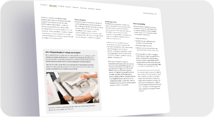 Across our business, we released eight products with more than 20 percent recycled content. 6 The MacBook Air with M1 chip (2020) had the highest total — made with 44 percent recycled content device-wide, including 100 percent recycled aluminum in the enclosure. These and other innovations helped us increase our use of recycled or renewable content to 18 percent of all the material shipped in products in fiscal year 2021. 7 Product longevity We want to make the most of the materials we use through designing long-lasting products. We are designing durable hardware, leveraging software updates to extend functionality, expanding access to repair services, refurbishing devices for their next user, and reusing parts that still have more to give. Read more on caring for customers on page 56 . Product end-of-life By effectively recovering the materials in our products, we enable the circular supply chains that make the best use of finite resources. Through our work in this area, we’re reducing the need to mine new materials and the amount of energy needed to manufacture new products, ultimately driving down emissions and conserving resources. In 99 percent of the countries where we sell products, we continue to provide and participate in product take-back and recycling collection programs. With the help of customer and employee participation across recycling programs, we directed more than 38,000 metric tons of e-waste to recycling globally in fiscal year 2021. We’ve also continued to innovate on disassembly technologies. Daisy, the robot we designed to disassemble iPhone devices, has now been joined by Dave, which dismantles Taptic Engines from iPhone to enable the recovery of materials like rare earth elements, tungsten, and steel, and Taz, designed to recycle modules containing rare earth magnets. At our Material Recovery Lab we’re working on developing better, more efficient means of disassembling products that maximize material recovery, while minimizing waste. Water stewardship We’re committed to managing the resources we share with the communities where we and our suppliers operate. Our efforts to address the water footprint of our corporate sites and of our suppliers’ sites focus on: • Using water efficiently • Expanding the use of alternative water sources, including onsite reuse • Discharging water responsibly • Enhancing our water stewardship to keep watersheds healthy for all who rely on them In fiscal year 2021, our facilities used about 1.4 billion gallons of water. We saved 133 million gallons of freshwater this fiscal year due to efficiency projects implemented since 2017. 9 Last year, alternative water sources accounted for 10 percent of our total corporate water usage — primarily from recycled water sources. 10 Our supply chain accounts for 99 percent of our total water footprint, based on our detailed water inventory. That’s why we partner closely with our suppliers through our Clean Water Program. The more than 195 participating supplier sites increased their average reuse rate to 41 percent and saved our suppliers 12.3 billion gallons of freshwater in fiscal year 2021 — for a total of 50.3 billion gallons of water savings since the program’s launch in 2013. 11 Innovating packaging to reduce our footprint We’ve made significant progress toward eliminating all plastics from our packaging by 2025. This past year, plastics accounted for only 4 percent of our packaging. Since 2015, we’ve dedicated our efforts to replacing large plastic trays, wraps, and foam cushioning with fiber alternatives that have higher recovery rates and reduced environmental footprints. This year, the iPhone 13 and iPhone 13 Pro were the first iPhone models to be shipped without any plastic packaging components. 8 And we replaced plastic foam with a fiber alternative to protect the 24-inch iMac during shipping. For the 24-inch iMac, using corrugated fiber rather than foam for shock absorption allowed us to reduce plastic by 72 percent. Appendix Governance Communities Suppliers Customers Our People Environment Introduction Apple’s 2022 ESG Report 19