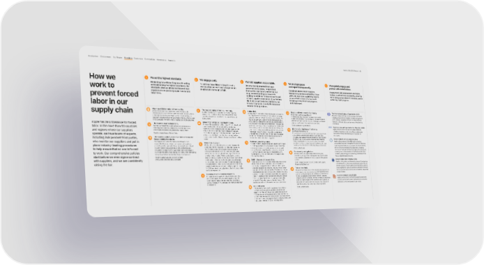 How we work to prevent forced labor in our supply chain Apple has zero tolerance for forced labor. In the more than 50 countries and regions where our suppliers operate, we have teams of experts, including independent third parties, who monitor our suppliers and put in place industry-leading procedures to help ensure that no one is forced to work. Our comprehensive policies start before we even sign a contract with suppliers, and we are consistently raising the bar. 1 We set the highest standards. Eliminating forced labor begins with setting and maintaining the highest standards. Our standards often go above and beyond legal requirements to protect people from forced labor risks. 2 We engage early. To address forced labor risks at its roots, we know that our work has to begin before people enter our supply chain. 3 We hold suppliers accountable. Once we’ve implemented thorough preventative measures, independent, third-party assessments verify that our suppliers are meeting our standards. Looking for evidence of forced labor is part of every supplier assessment. If we find any violations of our Code and Standards, we take swift action to remedy the issue and improve their operations. 4 We track progress and report transparently. Consistent improvement requires transparency and accountability. Since 2007, we have been publishing reports on our efforts across all of our work to transparently share our progress and challenges. 5 We regularly engage and partner with stakeholders. Engagement with stakeholders and rights holders is critical to accountability, ensuring we’re taking action where it’s needed, and to achieving rapid progress. Aligning with international frameworks. Apple policies and our supplier requirements align with international labor and human rights standards, including those of the International Labour Organization, the United Nations Guiding Principles on Business and Human Rights (UNGPs), and the Organisation for Economic Co-Operation and Development. The Apple Human Rights Policy Our Human Rights Policy outlines how we treat everyone, including our customers, employees, business partners, and the people across every level of our supply chain. Read the Apple Human Rights Policy The Apple Supplier Code of Conduct and Supplier Responsibility Standards Our supplier requirements contain strict standards for responsible labor recruitment, and apply to all suppliers, protecting workers globally. We go above and beyond legal requirements in many places by strictly prohibiting labor recruitment in regions where we cannot conduct adequate due diligence and by maintaining a zero recruitment fees policy, because we believe no one should pay to secure a job. Read the Apple Supplier Code of Conduct and Supplier Responsibility Standards Thorough mapping informs our strategy. An effective strategy requires deep understanding of our supply chain. To date, we have mapped over 1000 labor recruitment agencies that work with our suppliers across 32 countries. A leading strategy requires leading tools. The Apple Responsible Labor Recruitment Toolkit, developed in partnership with the International Organization for Migration, provides suppliers and their labor agencies with easy-to-use tools that help them effectively manage and report data, mitigating forced labor risks before people even enter our supply chain. In addition to providing hands-on training, we are making these tools openly available for others to use. Awareness is power. We require our suppliers to provide their employees with training on their workplace rights on their first day on the job. This helps to ensure that every person is aware of their rights and what to do if they’re not being respected, which includes the ability to anonymously contact Apple directly. Foreign Contract Workers, who make up a very small percentage of people in our supply chain, also receive training prior to leaving their home country, as well as upon arriving in their destination country. To date, our suppliers have provided workplace rights training to over 23.6 million people. In addition, last year we directly engaged with over 350,000 people in our supply chain to learn more about their workplace experience. Investing in consistent improvement. Through our new Supplier Employee Development Fund, we’re investing $50M to expand programs designed to continue to improve the rights training experience, worker voice platforms, and supplier employee education opportunities. A close look. We regularly conduct independent, third-party assessments, including surprise assessments, of our suppliers, verifying compliance with over 500 points across our standards. This includes an extensive document review to be sure all hiring and personnel records are in place and accurate. In addition to specialized forced labor assessments for at-risk suppliers, we also require many suppliers to participate in facility-wide assessments, such as the Validated Assessment Program, to verify performance across the supplier’s entire business. In the event that we find gaps in a supplier’s compliance or capabilities, we require them to implement a Corrective Action Plan. To date, our assessments have covered 94 percent of our direct manufacturing spend. We investigate every report. In addition to thoroughly assessing our suppliers’ performance in upholding our standards, we also receive reports from the press, governments, civil society, and people in our supply chain, and we encourage the public to report concerns via https://www.apple.com/uk/supplier-responsibility/. We investigate every report, and frequently have Apple teams onsite within 24 hours. Swift action and steep penalties. Forced labor in any form is a Core Violation (the most serious violation level) of our requirements. If a Core Violation is discovered, the supplier’s CEO is notified and the supplier is immediately placed on probation, pending the successful completion of a Corrective Action P