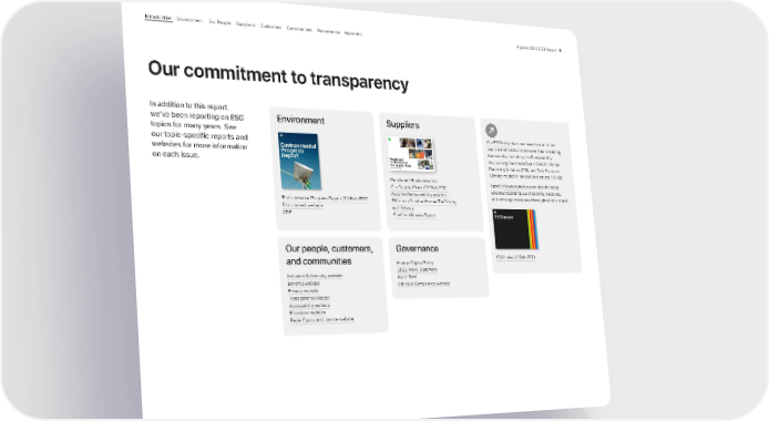 Suppliers People and Environment in Our Supply Chain (22.5Mb PDF) Supplier Responsibility website Efforts to Combat Human Trafficking and Slavery Conflict Minerals Report Our ESG Index demonstrates how all of our reports and public disclosures map to leading frameworks, including the Sustainability Accounting Standards Board (SASB), Global Reporting Initiative (GRI), and Task Force on Climate-related Financial Disclosures (TCFD). Apple’s Newsroom also provides the latest updates regarding our programs, initiatives, and offerings mentioned throughout this report. Environment Environmental Progress Report (24.5Mb PDF) Environment website CDP Governance Human Rights Policy 2022 Proxy Statement Form 10-K Ethics & Compliance website Our people, customers, and communities Inclusion & Diversity website Benefits website Privacy website Transparency Report Accessibility website Education website Racial Equity and Justice website ESG Index ESG Index (2.6Mb PDF) Our commitment to transparency In addition to this report, we’ve been reporting on ESG topics for many years. See our topic-specific reports and websites for more information on each issue. Covering fiscal year 2021 Environmental Progress Report 2022 Annual Progress Report People and Environment in Our Supply Chain Apple’s 2022 ESG Report 8 Appendix Governance Communities Suppliers Customers Our People Environment Introduction