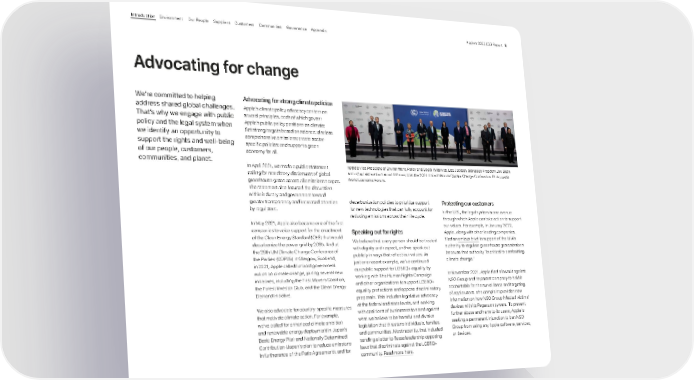 We’re committed to helping address shared global challenges. That’s why we engage with public policy and the legal system when we identify an opportunity to support the rights and well-being of our people, customers, communities, and planet. decarbonization policies to prioritize support for new technologies that can fully account for reducing emissions across their life cycle. Speaking out for rights We believe that every person should be treated with dignity and respect, and we speak out publicly in ways that reflect our values. As just one recent example, we’ve continued our public support for LGBTQ+ equality by working with The Human Rights Campaign and other organizations to support LGBTQ+ equality protections and oppose discriminatory proposals. This includes legislative advocacy at the federal and state levels, and working with coalitions of businesses to stand against what we believe to be harmful and divisive legislation that threatens individuals, families, and communities. Most recently, that included sending a letter to Texas leadership opposing laws that discriminate against the LGBTQ+ community. Read more here . Protecting our customers In the U.S., the legal system is one avenue through which Apple can take action to support our values. For example, in January 2022, Apple, along with other leading companies, filed an amicus brief in support of the EPA’s authority to regulate greenhouse gas emissions because that authority “is critical to combatting climate change.” In November 2021, Apple filed a lawsuit against NSO Group and its parent company to hold it accountable for the surveillance and targeting of Apple users. The complaint provides new information on how NSO Group infected victims’ devices with its Pegasus spyware. To prevent further abuse and harm to its users, Apple is seeking a permanent injunction to ban NSO Group from using any Apple software, services, or devices. Apple’s Vice President of Environment, Policy and Social Initiatives, Lisa Jackson, alongside President Joe Biden and other leaders from around the world at the 2021 United Nations Climate Change Conference. Photo credit: World Economic Forum. Advocating for strong climate policies Apple’s climate policy advocacy centers on several principles, each of which govern Apple’s public policy positions on climate: Set strong targets based on science; disclose comprehensive emissions; create sector- specific policies; and support a green economy for all. In April 2021, we made a public statement calling for mandatory disclosures of global greenhouse gases across all emissions scopes. The statement also focused the discussion within industry and government toward greater transparency and increased attention by regulators. In May 2021, Apple also became one of the first companies to voice support for the enactment of the Clean Energy Standard (CES) that would decarbonize the power grid by 2035. And at the 26th UN Climate Change Conference of the Parties (COP26) in Glasgow, Scotland, in 2021, Apple called for bold government action on climate change, joining several new initiatives, including the First Movers Coalition, the Forest Investor Club, and the Clean Energy Demand Initiative. We also advocate for country-specific measures that motivate climate action. For example, we’ve called for enhanced climate ambition and renewable energy deployment in Japan’s Basic Energy Plan and Nationally Determined Contribution (Japan’s plan to reduce emissions in furtherance of the Paris Agreement), and for Advocating for change Apple’s 2022 ESG Report 9 Appendix Governance Communities Suppliers Customers Our People Environment Introduction