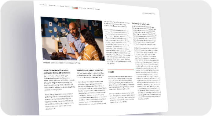 Apple Distinguished Educators and Apple Distinguished Schools Our community of nearly 3000 Apple Distinguished Educators in 45 countries model, advise, advocate, and publish materials on ways to integrate Apple technology into teaching and learning. These educators are active leaders, helping to make learning deeply personal for every student. Apple Distinguished Schools are centers of leadership and educational excellence that demonstrate the impact of learning with Apple technology. The nearly 700 schools across 36 countries cultivate environments where students are excited and curious about learning. Inspiration and support for teachers We help educators share experiences, ideas, and inspiration, so that they too can get more out of the technology in their classrooms. Apple Teacher is a free online, self-paced professional learning program that helps teachers build their skills and confidence in teaching with Apple technology and earn Apple Teacher recognition. Our Apple Professional Learning Specialists are experts who provide one-on-one coaching sessions and group professional learning workshops for educators, in addition to the support resources available online or via phone. The majority of our educator tools are free, and we offer special pricing on Mac, iPad, and other Apple hardware for education institutions, eligible college students, and education faculty and staff. In March 2022, we unveiled Apple Learning Coach, which is a free professional learning program that trains instructional coaches, digital learning specialists, and other coaching educators to help teachers effectively use Apple technology in the classroom. Through a mix of self-paced lessons and virtual workshop sessions with Apple Professional Learning Specialists, participants come away from the experience with an actionable portfolio, a cohort of peers, and the opportunity to apply for continuing education credits from Lamar University through the Texas Education Agency. Each Apple Learning Coach gains a deeper understanding of how to support teachers where they are, as they integrate technology into learning. Health Apple empowers our users to take control of their health by making it easier to track and share their health and wellness information while always keeping their data secure. This allows for a more informed dialogue with loved ones and doctors, offering the ability to make better health choices on a daily basis. Privacy is a fundamental aspect of our health work. The right place for health information to exist is with a user on their device, and where or how that information is shared should be completely up to the individual. Professional learning is a key piece of Apple’s education offerings. Technology for better health Since launching Apple Watch in 2015, we’ve been constantly inspired by the stories we hear from our users about how using Apple Watch for health and fitness has changed their lives. These range from users who found closing their Activity rings every day motivated them to be in the best shape of their lives to those alerted to a potential irregular heart rhythm who sought medical care to confirm. Stories like those continually drive us to do more for our users. Building on innovative features for Apple Watch like the ECG app, irregular rhythm notifications, and fall detection, Apple recently introduced a variety of services and features to help people on their health and fitness journeys. Apple Fitness+ is an award-winning fitness and wellness service powered by Apple Watch and designed to be welcoming to all, wherever they are in their journey. Fitness+ helps users train their body and mind with a personalized and engaging experience that can be done anytime, anywhere; intelligently incorporates workout metrics from Apple Watch right on the screen; and motivates users from start to finish with music from today’s top artists. Features like Handwashing, Sleep, and Blood Oxygen offer more insights into users’ overall wellness to make more informed decisions for themselves. Apple Watch users can also view a classification of their Cardio Fitness Level — a powerful predictor of overall health — in the Health app, and receive a notification if it falls within the “low” range. The breakthrough technology allows users to better understand their cardio fitness measurements taken right from their own wrist. Appendix Governance Communities Suppliers Customers Our People Environment Introduction Apple’s 2022 ESG Report 54