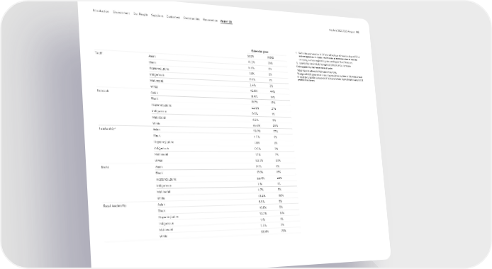 Calendar year 2021 2020 Tech 1 Asian 41.2% 39% Black 5.5% 6% Hispanic/Latinx 7.8% 8% Indigenous 0.5% 1% Multiracial 2.4% 2% White 42.6% 44% Nontech Asian 13.8% 13% Black 13.7% 12% Hispanic/Latinx 22.3% 21% Indigenous 0.9% 1% Multiracial 4.0% 4% White 45.2% 49% Leadership 2 Asian 29.2% 27% Black 4.0% 4% Hispanic/Latinx 7.8% 8% Indigenous 0.5% 0% Multiracial 1.7% 2% White 56.9% 59% Retail Asian 9.1% 8% Black 17.9% 15% Hispanic/Latinx 25.4% 23% Indigenous 1.1% 1% Multiracial 4.7% 5% White 41.6% 48% Retail leadership Asian 5.5% 5% Black 10.8% 8% Hispanic/Latinx 13.7% 13% Indigenous 1.1% 1% Multiracial 2.5% 2% White 66.4% 70% 1. Tech roles are based on U.S. Federal Employer Information Report EEO-1 skill designations. At Apple, this includes all technical roles across the company, such as engineering roles and Apple Store Geniuses. 2. Leadership roles include managers at all levels of our company. Data supplied by the People team at Apple. Totals may not add up to 100% due to rounding. To align with U.S. government reporting requirements, data on this website uses the traditional gender categories of male and female. Apple deeply respects that gender is not binary. Appendix Governance Communities Suppliers Customers Our People Environment Introduction Appleās 2022 ESG Report 82