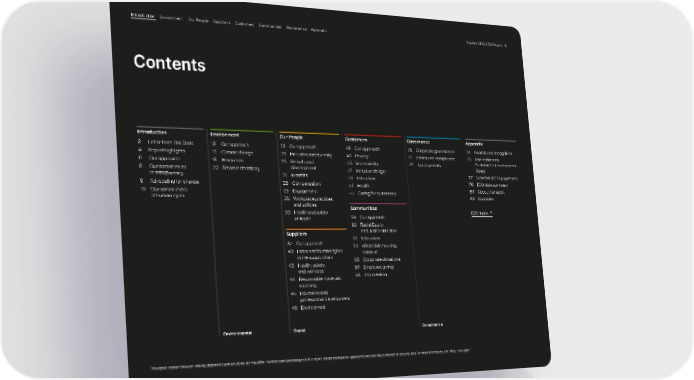 Introduction 3 Letter from Tim Cook 4 Report highlights 6 Our approach 8 Our commitment to transparency 9 Advocating for change 10 Our commitment to human rights Environment 13 Our approach 13 Climate change 18 Resources 20 Smarter chemistry Our People 23 Our approach 23 Inclusion and diversity 26 Growth and development 27 Benefits 28 Compensation 29 Engagement 30 Workplace practices and policies 33 Health and safety at Apple Suppliers 37 Our approach 40 Labor and human rights in the supply chain 43 Health, safety, and wellness 44 Responsible materials sourcing 45 Education and professional development 46 Environment Customers 48 Our approach 48 Privacy 50 Accessibility 52 Inclusive design 53 Education 54 Health 55 Caring for customers Communities 59 Our approach 60 Racial Equity and Justice Initiative 62 Education 64 Affordable housing initiative 65 Corporate donations 67 Employee giving 68 Job creation Governance 70 Corporate governance 71 Ethics and compliance 72 Tax payments Appendix 74 Awards and recognition 75 United Nations Sustainable Development Goals 77 Stakeholder engagement 78 ESG data summary 84 About the report 85 Endnotes ESG Index ↗︎ This report contains forward-looking statements and actual results may differ. Numbers and percentages in this report include estimates or approximations and may be based on assumptions. For more information, see “About the report.” Contents Environmental Social Governance Apple’s 2022 ESG Report 2 Appendix Governance Communities Suppliers Customers Our People Environment Introduction
