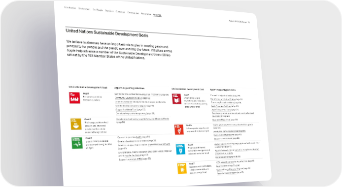 UN Sustainable Development Goal Apple’s supporting initiatives Goal 1 End poverty in all its forms everywhere Commitment to combat the housing crisis in California (page 64) Community Education Initiative (page 62) Supplier Standards relating to minimum wages and benefits Commitment to competitive wages (page 28) Support for Malala Fund (page 66) Donations help to alleviate poverty (page 65) Goal 2 End hunger, achieve food security and improved nutrition and promote sustainable agriculture Donations to food banks, soup kitchens, and Meals on Wheels (page 65) Goal 3 Ensure healthy lives and promote well-being for all at all ages Our work to promote health (page 54) Smarter chemistry in our products (page 20) Benefits to support team member physical and mental health (page 27) Environmental, health, and safety practices at Apple (page 33) and at supplier facilities (page 43) Support for product (RED) (page 65) UN Sustainable Development Goal Apple’s supporting initiatives Goal 4 Ensure inclusive and equitable quality education and promote lifelong learning opportunities for all Our work to support education (page 53) Racial Equity and Justice Initiative (page 60) Community Education Initiative (page 62) Apple Developer Academy (page 63) Apple Entrepreneur Camp (page 64) Supplier programs to promote education and professional development (page 45) Support for Malala Fund (page 66) Goal 5 Achieve gender equality and empower all women and girls Gender pay equity and diversity policies and programs (page 28) Anti-human trafficking policy and programs Supplier diversity programs (page 45) Support for Malala Fund (page 66) Goal 6 Ensure availability and sustainable management of water and sanitation for all Apple’s water stewardship programs at our facilities and in our supply chain (page 19) Apple’s Restore Fund and support for ecosystem restoration and protection projects Responsible packaging initiatives Goal 7 Ensure access to affordable, reliable, sustainable and modern energy for all 100% renewable energy for Apple facilities (page 16) Supplier Clean Energy Program Supplier Energy Efficiency Program (page 46) Power for Impact program (page 16) United Nations Sustainable Development Goals We believe businesses have an important role to play in creating peace and prosperity for people and the planet, now and into the future. Initiatives across Apple help advance a number of the Sustainable Development Goals (SDGs) set out by the 193 Member States of the United Nations. Appendix Governance Communities Suppliers Customers Our People Environment Introduction Apple’s 2022 ESG Report 75