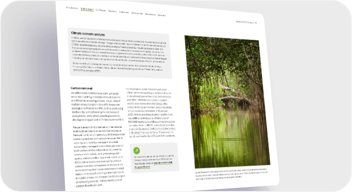Carbon removal To address the emissions we can’t yet avoid, we’re are investing in carbon removal projects. In addition to removing carbon, nature-based carbon removal projects also offer important ecological and social benefits, such as preserving biodiversity and enhancing the resilience of ecosystems, while often providing economic development opportunities for local communities. We partnered with Conservation International and Goldman Sachs to launch the innovative Restore Fund, which seeks to blend responsible forestry practices with carbon removal: We’re working with forestry managers to create sustainably managed forests that optimize for both carbon and wood production, creating revenue from timber, and generating high- quality carbon credits. Apple will invest up to $200 million in projects that aim to remove carbon from the atmosphere and store it, all while meeting clear social and environmental impact criteria and offering a financial return. In its pilot phase, the Restore Fund has a goal of removing at least 1 million metric tons of carbon dioxide per year. For more information on our efforts to combat climate change and reach our 2030 carbon neutral goal, read our 2022 Environmental Progress Report . Climate scenario analysis In 2020, we conducted a climate scenario analysis to help us better understand the potential physical and transition effects of climate change. To align with the Task Force on Climate-related Financial Disclosures (TCFD) recommendations, we considered a range of future scenarios, including a scenario below 2°C. And we assessed geographies around the world to capture both corporate and supplier activities. The analysis highlighted how our renewable energy program and carbon neutrality goals could contribute to our corporate resiliency. It also provided environmental data that we considered in developing business strategies, including considerations around supply chain diversification, as well as safeguarding our global assets. We’re committed to managing regulatory, reputational, and market risks related to climate change. For more information on these climate-related risks and Apple’s governance of these risks, read our 2021 CDP submission (PDF) . As the Restore Fund projects come online, we’ve partnered with Conservation International to develop and invest in nature-based carbon removal projects. This includes a project to protect and restore 27,000 acres of mangrove forests in Colombia. As the projects in the Restore Fund come online, we’re also working to address difficult- to-avoid emissions in the short term. In fiscal year 2021, 167,000 metric tons of carbon credits were retired from the Chyulu Hills project in Kenya to maintain carbon neutrality for our corporate emissions in fiscal year 2021. And we purchased carbon credits from two additional projects to offset a total of 500,000 metric tons of direct emissions across our value chain: a REDD+ coastal conservation project in Guatemala and a reforestation project in Guizhou Province of China . These projects are all certified to the VCS and CCB standards. Appendix Governance Communities Suppliers Customers Our People Environment Introduction Apple’s 2022 ESG Report 17