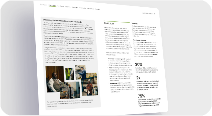 Resources Natural resources make our work possible — and we take responsibility for how we source, use, and recycle the materials we rely on to create our products. As a starting point, this means sourcing responsibly, minimizing our freshwater use, and eliminating waste across our operations and those of our suppliers. And we’re also seeking to redefine the overall resource footprint of our products. Our goal is to one day make products using only responsibly sourced recycled and renewable materials. Within resources, we focus on three main areas of impact: • Materials: Transitioning to only recycled or renewable materials in our products and packaging, and maximizing material efficiency, product longevity, and recovery. • Water: Reducing water impacts in the manufacturing of our products, use of our services, and operation of our facilities. At the same time, transitioning to alternative sources, improving the quality of water we discharge, and protecting shared water resources. • Zero waste: Minimizing overall waste generated and eliminating waste sent to landfill from our manufacturing supply chain as well as corporate offices, data centers, and retail stores. Materials We aim to make the best use of the materials we rely on to make our products. That’s why we’re focusing on three different levers to reduce our footprint and achieve circularity: sourcing and efficiency; product longevity; and product end-of-life. Sourcing and efficiency Last year, we made progress across materials — from expanding our use of recycled rare earth elements to designing cameras with recycled gold. In September, we introduced iPhone 13, with more certified recycled materials than any previous version of iPhone. We also introduced 100 percent recycled aluminum enclosures on every single model in the iPad lineup. Welcoming the first class of the Impact Accelerator Last year, we welcomed the first class to our Impact Accelerator, a program for Black- ,Hispanic/Latinx-, and Indigenous-owned businesses headquartered in the United States that share our focus on innovation and our commitment to the environment. Part of Apple’s Racial Equity and Justice Initiative (see page 60 ), the Accelerator aims to help combat systemic barriers to opportunity, while also advancing innovative solutions for communities most impacted by climate change. We selected our first class of 15 businesses on the cutting edge of green technology and clean energy to begin the program in August 2021. The three-month program included live virtual sessions, online courses on supply chain management, supplier diversity, financial and legal subjects, as well as one-on-one mentorship with an Apple expert on topics from renewable energy to responsible sourcing. The goal of the Impact Accelerator is to better position the participating companies for growth, to improve their abilities to take on larger contracts, and to expand their customer base — all while fostering their environmental commitment. For example, last October we announced that we will be working with the Oceti Sakowin Power Authority, formed by six Sioux tribes to jointly develop tribal renewable energy resources, on a project to create a wind power development in the Midwest. And following the success of this year’s class, our efforts continue. This spring, applications opened for the next class to join our Impact Accelerator. For Apple’s inaugural Impact Accelerator, leaders from 15 companies participated in a three-month virtual program with customized training and access to Apple expert mentors. 20% In fiscal year 2021, nearly 20 percent of the material we shipped in products came from recycled and renewable sources 2x In fiscal year 2021, we more than doubled our use of recycled tungsten, rare earth elements, and cobalt — and introduced certified recycled gold for the first time in an Apple product 75% We’ve reduced the plastic in our packaging by 75 percent compared with 2015, progressing toward our goal to eliminate all plastic from our packaging by 2025 Appendix Governance Communities Suppliers Customers Our People Environment Introduction Apple’s 2022 ESG Report 18