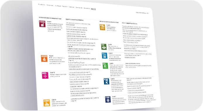 UN Sustainable Development Goal Apple’s supporting initiatives Goal 8 Promote sustained, inclusive and sustainable economic growth, full and productive employment and decent work for all Job creation and economic contributions of App Store ecosystem Our work to support education (page 53) Community Education Initiative (page 62) Apple Developer Academy (page 63) Apple Entrepreneur Camp (page 64) Supplier diversity programs (page 45) Racial Equity and Justice Initiative (page 60), including Apple’s Impact Accelerator (page 18) Our commitment to a highly competitive wage (page 28) Gender pay equity and diversity policies and programs (page 28) Programs to respect labor and human rights in our manufacturing supply chain (page 40) Anti-human trafficking policy and programs Goal 9 Build resilient infrastructure, promote inclusive and sustainable industrialization and foster innovation Job creation (page 68) Commitment to combat the housing crisis in California (page 64) Supplier Clean Energy Program Apple’s procurement and generation of 100% renewable energy for its facilities (page 16) Apple’s R&D investments in and creation of new technology Goal 10 Reduce inequality within and among countries Inclusion and diversity at Apple (page 23) Racial Equity and Justice Initiative (page 60) Our work to support education (page 53) Community Education Initiative (page 62) Apple Developer Academy (page 63) Apple Entrepreneur Camp (page 64) Accessibility (page 50) Our commitment to a highly competitive wage (page 28) Supplier diversity programs (page 45) Training supplier employees on their rights and for professional development Goal 11 Make cities and human settlements inclusive, safe, resilient and sustainable Commitment to combat the housing crisis in California (page 64) UN Sustainable Development Goal Apple’s supporting initiatives Goal 12 Ensure sustainable consumption and production patterns Transitioning all materials in Apple’s products and packaging to recycled and renewable sources (page 18) Advancing zero waste initiatives at our facilities and in our supply chain (page 20) Incorporating smarter chemistry in our products (page 20) Advancing smarter chemistry in manufacturing (page 43) Product trade-in and recycling programs (page 57) Responsible materials sourcing (page 44) Responsible packaging initiatives Goal 13 Take urgent action to combat climate change and its impacts Our ambitious goals and programs to mitigate climate change , including our commitment to carbon neutrality for all of our products by 2030 (page 13) Advocating for strong climate change policy (page 9) Goal 14 Conserve and sustainably use the oceans, seas and marine resources for sustainable development Reducing our impact on ocean acidification through our climate change mitigation activities (page 13) Mangrove conservation Goal 15 Protect, restore and promote sustainable use of terrestrial ecosystems, sustainably manage forests, combat desertification, and halt and reverse land degradation and halt biodiversity loss Responsible packaging initiatives Apple’s Restore Fund and support for ecosystem restoration and protection projects Goal 16 Promote peaceful and inclusive societies for sustainable development, provide access to justice for all and build effective, accountable and inclusive institutions at all levels Racial Equity and Justice Initiative , criminal justice reform (page 60) Supplier Code of Conduct (anti-corruption and non- discrimination practices) (page 37) Apple’s Business Conduct Policy and Practices (page 71) Our work on privacy (page 48) Supplier diversity programs (page 45) Inclusion and diversity at Apple (page 23) Goal 17 Strengthen the means of implementation and revitalize the Global Partnership for Sustainable Development Developing solutions to global challenges is never an easy journey, and it isn’t one that can be undertaken alone. We pursue partnerships with organizations around the world to further efforts to make the world better. These partnerships are described throughout this report and on apple.com . Appendix Governance Communities Suppliers Customers Our People Environment Introduction Apple’s 2022 ESG Report 76