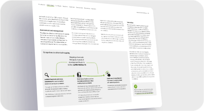 protocols as part of our CSD program. Through this process, we’ve identified more than 17,000 chemicals and applications. These efforts contribute to a safer work environment for people across our supply chain. Assessment and management The data we collect on chemicals and materials forms the foundation for key decisions that have an impact on our product designs, manufacturing processes, and approach to recycling and reuse. This data enables us to establish requirements for our suppliers, including those set out in our Regulated Substances Specification (RSS) and the Restricted Chemicals for Prolonged Skin Contact Materials list . These requirements provide clear guidelines on potentially harmful materials, including those that are restricted. Our assessment system helps to ensure that only materials that meet our stringent requirements are used in Apple products. At our Environmental Testing Lab, we evaluate the safety of our products and materials through chemical analyses. Our chemists test materials for safety and monitor compliance with our specifications. In fiscal year 2021, we performed toxicological assessments on 1000 new materials to proactively evaluate and eliminate potentially harmful substances from our products. Both the data we gather on chemicals and our rigorous assessments allow us to make informed decisions and manage chemicals, for the safety of those who use, make, and recycle our products. Comprehensive chemical mapping Understanding chemical ingredients leads to better materials for Apple products Through our Full Material Disclosure (FMD) program, manufacturers share chemical ingredients used to make materials with Apple. With FMD data, Apple evaluates the chemicals in materials against restrictions. Data helps Apple suppliers manage chemicals when making Apple products Information on how chemicals are used, how they’re stored, and how employees are protected is shared with Apple by suppliers through our Chemical Safety Disclosure (CSD) program. CSD data informs and prioritizes supplier engagement, helping to ensure rigorous chemical management practices and adoption of safer alternatives. Apple customers benefit from use of products made with safer ingredients The FMD and CSD programs help support creation of best-in-class products in a responsible manner for our customers. Mapping chemicals Mapping chemicals throughout product throughout product development leads to development leads to better, better, safer products safer products Read more about our commitment to using safer materials to create safer products in our 2022 Environmental Progress Report Innovation The work we do in mapping, assessing, and managing the chemicals within our supply chain underpins our innovations. We rely on detailed information on the material properties, including toxicological data and environmental performance characteristics. We also look at how these materials are used at each point in the product life cycle, from design, to manufacturing, to end-of-life. This allows us to seek out and support the development of safer chemistries that have an impact on each phase — and contribute to continually improving the overall safety of our products and processes. Since the late 1990s, we have diligently identified and removed potentially harmful chemicals from our products, such as brominated flame retardants, beryllium, mercury, and lead. We’re also driving the use of safer process chemicals in our supply chain: Since 2018, all our final assembly sites have used only safer alternative cleaners and degreasers. As we work toward minimizing potentially harmful chemistries in our products and processes, we’re making the transition to safer alternatives accessible to others through industry initiatives, partnerships, and standards with the hope of driving chemical safety across the industry. Appendix Governance Communities Suppliers Customers Our People Environment Introduction Apple’s 2022 ESG Report 21