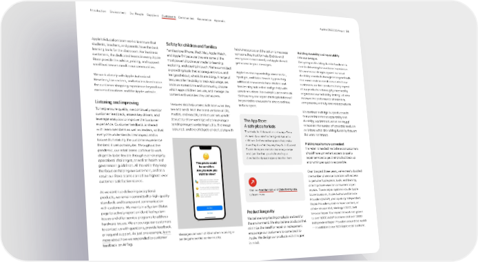 Apple’s Education team works to ensure that students, teachers, and parents have the best learning tools for the classroom. For business customers, the dedicated teams in every Apple Store provide the advice, pricing, and support small businesses need in our communities. We work closely with Apple Authorized Resellers, like carriers, and retailers to enhance the customer shopping experience beyond our own retail locations and the Apple website. Listening and improving To help ensure quality, we continually monitor customer feedback, assess key drivers, and leverage analytics to improve the customer experience. Customer feedback is shared with team members as well as leaders, so that everyone understands their impact and is focused on making the customer experience the best it can possibly be. Throughout the pandemic, our retail teams continue to work diligently to be flexible through ever-changing operational challenges, as well as health and government guidelines. All the while they keep the focus on helping our customers, and as a result our Store teams earned our highest-ever customer satisfaction scores. As we continue delivering exceptional products, we remain committed to high-quality standards and transparent communication with customers. We maintain a System Status page to actively report on identified system issues and offer service programs to address hardware issues. We encourage our customers to contact us with questions, provide feedback, or request support. As just one example, learn more about how we responded to customer feedback on AirTag. Safety for children and families Families love iPhone, iPad, Mac, Apple Watch, and Apple TV because they are some of the most powerful tools ever made for learning, exploring, and staying in touch. We’re committed to providing tools that let caregivers know, and feel good about, what kids are doing. A range of features offer flexibility to track app usage, set limits on screen time and community, choose which apps children can use, and manage the content and websites they can access. Features also help protect kids from what they see and send. With the latest versions of iOS, iPadOS, and macOS, families can set up kids’ devices to show warnings when receiving or sending images containing nudity. The image is blurred, and the child gets an alert along with Building durability and repairability into our designs Designing and building durable hardware is core to delivering this customer experience. We assess our designs against our strict durability standards through testing methods that mimic realistic conditions in which our customers use their products. Every aspect of our products is thoroughly assessed by engineers in our Reliability Testing Lab who measure the performance of materials, components, and fully assembled products. We continue to design our products with features that enhance repairability and durability. For instance, we’ve continued to increase the number of repairable modules on iPhone while also adding durability features like water resistance. Making repairs more convenient If a repair is needed, we believe our customers should have convenient access to quality repair services to get their product back up and running as quickly as possible. Over the past three years, we’ve nearly doubled the number of service locations with access to genuine Apple parts, tools, and training, offering more ways for consumers to get repairs. These repair options include Apple Store locations, Apple Authorized Service Providers (AASP), participating Independent Repair Providers, mail-in repair centers, or onsite service and, starting in 2022, Self Service Repair. Our repair network has grown to over 5000 AASP locations and over 3000 Independent Repair Providers around the world — in addition to our 500 Apple retail locations. Visit our Families site and Child Safety site to learn more The App Store: A safe place for kids The Made for Kids section on the App Store is carefully curated to be a great space for children. And we review apps to help make sure they do what they say they do. In Content Restrictions, you can also tap an age range and, just like that, your kids can buy or download only apps appropriate for them. Messages can warn children when receiving or sending photos that contain nudity. helpful resources and the option to message someone they trust for help. End-to-end encryption is maintained, and Apple doesn’t get access to your messages. Apple has also expanded guidance in Siri, Spotlight, and Safari Search by providing additional resources to help children and families stay safe online and get help with unsafe situations. For example, users who ask Siri how they can report child exploitation will be pointed to resources for where and how to file a report. Product longevity We believe long-lasting products are best for the environment. We also believe products that minimize the need for repair or replacement encourage our customers to come back to Apple. We design our products with this goal in mind. Appendix Governance Communities Suppliers Customers Our People Environment Introduction Apple’s 2022 ESG Report 56