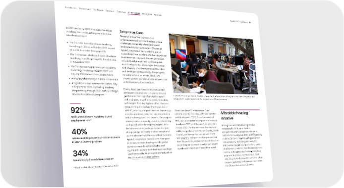 Located in downtown Detroit, the Apple Developer Academy space is designed to facilitate collaboration and engagement, preparing students for success in the iOS app economy. In 2021 and early 2022, the Apple Developer Academy has continued to grow with these new developments: • The first U.S. Apple Developer Academy, launching in Detroit in October 2021 as part of our REJI initiative (see page 60 ) • The first women-dedicated Apple Developer Academy, launching in Riyadh, Saudi Arabia, in November 2021 • The first Korean Apple Developer Academy, launching in Pohang in March 2022 and serving 200 students from across Korea • A new foundation program location in France • A significant new investment in Naples, Italy, in September 2021, expanding academy programming through 2025 and launching a new alumni resource program Entrepreneur Camp Research shows that founders from underrepresented communities face unique challenges, especially when starting and leading technology companies. We created Apple Entrepreneur Camp with the goal of supporting these founders and their app-driven businesses as they build the next generation of cutting-edge apps, and to form a global alumni network that encourages the pipeline and longevity of underrepresented founders and developers in technology. The program includes cohorts for female, Black, and Hispanic/Latinx founders and developers from underrepresented communities. During these app-focused technology labs, participants receive one-on-one code-level guidance on their apps from Apple experts and engineers, as well as support, inspiration, and insights from top Apple leaders. The core programming is based on Developer Labs at WWDC, where participants work on improving a specific app in bespoke, one-on-one sessions with Apple engineers and experts. The program also includes community sessions, networking, and opportunities for ongoing support. After the lab concludes, participants become part of a growing community of other exceptional alumni who can help them build their business. Apple Entrepreneur Camp alumni have gone on to secure major funding rounds, garner numerous awards and accolades, and significantly expand both their teams and app users worldwide. Alumni apps are featured on the Entrepreneur Camp website . There have been 12 Entrepreneur Camp cohorts since our first class of female founders and developers in 2019. Since the launch of REJI, we expanded to hosting cohorts for Black founders in 2021 and Hispanic/Latinx founders in early 2022. Participants have also received additional guidance from Harlem Capital, Collab Capital, and Vamos Ventures as part of REJI (see page 61 ). Entrepreneur Camp alumni hail from 26 countries, and we continue to focus on expanding our outreach to underrepresented founders and developers around the world. Affordable housing initiative Through our affordable housing initiative, announced in 2019, we’ve made a comprehensive $2.5 billion commitment to address the housing availability and affordability crisis in California. Together with government and community-based organizations, the initiative has sought to jump-start long-term developments, help first-time buyers purchase homes, and support new housing and related programs to alleviate homelessness. As of July 2021, we’ve deployed more than $1 billion supporting projects and communities in more than 25 counties across California. 92% Apple Development Academy alumni employment rate* 40% female and 39 percent non-STEM students in 2021 academy program 34% female in 2021 foundations program * As of our last alumni survey in December 2021 Appendix Governance Communities Suppliers Customers Our People Environment Introduction Apple’s 2022 ESG Report 64