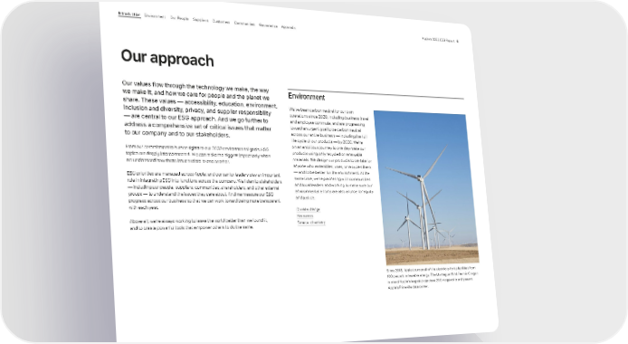 Our approach Our values flow through the technology we make, the way we make it, and how we care for people and the planet we share. These values — accessibility, education, environment, inclusion and diversity, privacy, and supplier responsibility — are central to our ESG approach. And we go further to address a comprehensive set of critical issues that matter to our company and to our stakeholders. From our commitment to human rights to our 2030 environmental goals, ESG topics are deeply interconnected. We can make the biggest impact only when we understand how these issues relate to one another. ESG priorities are managed across Apple, and our senior leaders play an important role in integrating ESG into functions across the company. We listen to stakeholders — including our people, suppliers, communities, shareholders, and other external groups — to understand the issues they care about. And we measure our ESG progress across our business so that we can work toward being more transparent with each year. Above all, we’re always working to leave the world better than we found it, and to create powerful tools that empower others to do the same. Since 2018, Apple sources all of the electricity for its facilities from 100 percent renewable energy. The Montague Wind Farm in Oregon is one of Apple’s largest projects at 200 megawatts and powers Apple’s Prineville data center. Environment We’ve been carbon neutral for our own operations since 2020, including business travel and employee commute, and are progressing toward an urgent goal to be carbon neutral across our entire business — including the full life cycle of our products — by 2030. We’re on an ambitious journey to one day make our products using only recycled or renewable materials. We design our products to be safe for anyone who assembles, uses, or recycles them — and to be better for the environment. At the same time, we’re partnering with communities and local leaders and working to make sure our environmental efforts are also a force for equity and justice. Climate change Resources Smarter chemistry Apple’s 2022 ESG Report 6 Appendix Governance Communities Suppliers Customers Our People Environment Introduction