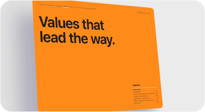 Suppliers In this section Our approach 37 Labor and human rights in the supply chain 40 Health, safety, and wellness 43 Responsible materials sourcing 44 Education and professional development 45 Environment 46 Values that lead the way. Appendix Governance Communities Suppliers Customers Our People Environment Introduction Appleās 2022 ESG Report 36