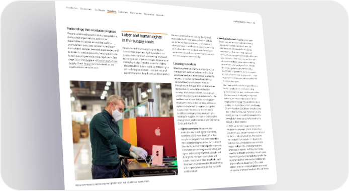 Partnerships that accelerate progress We are collaborating with industry associations, civil society organizations, and multi- stakeholder initiatives around the world to promote best practices, to listen to and learn from others’ perspectives and experiences, and to scale innovative solutions, helping everyone to achieve progress at a more rapid pace. See page 32 of the People and Environment in Our Supply Chain Report for more detail on the organizations we work with. Labor and human rights in the supply chain People come first in everything we do. Our commitment to protecting the people in our supply chain has been unwavering, anchored by a simple set of beliefs: People deserve to be treated with dignity and to know their rights. They should be able to speak up if those rights are not being respected — and to know and expect that when they do, we will listen and act. We’re committed to respecting the rights of every individual in our supply chain. We are committed to respecting the rights of every individual in our supply chain — just like we do for our team members, customers, and other partners — and more broadly, to working with others to share our tools and the lessons we’ve learned, and to empowering everyone to achieve progress more rapidly. Listening to workers Effective grievance channels, ongoing worker management communications, and supplier employee feedback are essential to ensuring respect for worker rights and maintaining safe and healthy workplaces. Whether through social dialogue and formal employee representation, workplace satisfaction surveys, anonymous hotlines, focus groups, or interviews during annual assessments, the feedback we receive directly from supplier employees helps us ensure labor and human rights are respected throughout our global supply chain. We also use this feedback to address emerging risks, improve rights training for supplier employees and supplier management, and to continually strengthen our Code and Standards. • Rights awareness: We believe that protection starts with rights awareness, and since 2008, more than 23.6 million supplier employees have been trained on their workplace rights. Under our Code and Standards, suppliers are required to provide employees with training on their workplace rights. This training is generally conducted during new employee orientation, and covers international labor standards, local labor laws, environmental health and safety, and the protections required by our Code and Standards • Feedback channels: Supplier employee interviews are an important part of every assessment conducted. Each year, we interview tens of thousands of supplier employees in their local language and without their managers present, to determine whether or not their experience on the job aligns with auditors’ observations during assessments. In fiscal year 2021, despite the ongoing challenges presented by the COVID-19 pandemic, we interviewed 87,626 workers in our supply chain — over 35,000 more than were interviewed in the previous fiscal year. Our Code and Standards require effective worker feedback channels, including grievance mechanisms, at all supplier sites. We also provide third-party anonymous hotlines, which are also available to our employees (see page 72 ), and the ability to contact the Apple Environment and Supply Chain Innovation (ESCI) team directly at any time and in any language. When an issue is raised, we require supplier management to immediately investigate and to resolve the issue in a timely manner. In 2021, we launched a grievance hotline awareness campaign, and its initial rollout resulted in a 22 percent increase in utilization of these third-party hotlines. The reports we received from supplier employees via hotlines in 2021 included issues related to wages and benefits, employee relations, amenities at supplier facilities, workforce stability, and health and safety. In each case, we investigated and worked directly with the suppliers to drive improvement and correct any compliance issues found. Suppliers implemented a number of actions as a result of supplier employee feedback through these Appendix Governance Communities Suppliers Customers Our People Environment Introduction Apple’s 2022 ESG Report 40