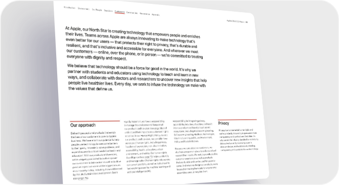 At Apple, our North Star is creating technology that empowers people and enriches their lives. Teams across Apple are always innovating to make technology that’s even better for our users — that protects their right to privacy, that’s durable and resilient, and that’s inclusive and accessible for everyone. And wherever we meet our customers — online, over the phone, or in person — we’re committed to treating everyone with dignity and respect. We believe that technology should be a force for good in the world. It’s why we partner with students and educators using technology to teach and learn in new ways, and collaborate with doctors and researchers to uncover new insights that help people live healthier lives. Every day, we work to infuse the technology we make with the values that define us. Responsibility for integrating privacy, accessibility, inclusion, education, and health into our products and services cuts across many teams, including Hardware Engineering, Software Engineering, Hardware Technologies, Machine Learning and AI, and Environment, Policy and Social Initiatives. Because we care about our customers, we also have programs in place to understand and support their needs. We work to provide positive customer experiences as well as products that are durable and can be used for years to come. And when we design our products, we’re focused on making them safe for anyone who assembles, uses, or recycles them. Privacy Privacy is a fundamental human right, and we’re constantly innovating to give users more transparency and control over their data. It’s why we set the industry standard for minimizing data collection and processing a user’s data on-device, and build industry-leading transparency and controls into our technology. Our approach Delivering exceptional products that enrich the lives of our customers is core to Apple’s business. We have enormous potential to help people use technology to overcome barriers to their goals, innovate to solve problems, and expand access to critical needs like health and education. With our products and services, we’re uniquely positioned to both empower our customers to take action as well as to drive positive impact on some of the biggest issues in our society today, including those addressed by the UN Sustainable Development Goals (see page 75 ). Equally important, we have a responsibility to manage the environmental footprint of our products and services (see page 13 ) and understand their impacts on customers’ rights as set out in our Human Rights Policy. Across our products and services, we consider how we respect human rights, including privacy, freedom of expression, non-discrimination, accessibility, health, education, a clean environment, and safety. Our human rights due diligence (see page 10 ) helps us identify and manage salient human rights risks across our current portfolio, as well as look ahead to fast-evolving areas like machine learning and artificial intelligence (AI). Appendix Governance Communities Suppliers Customers Our People Environment Introduction Apple’s 2022 ESG Report 48