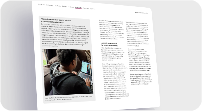 To further advance our work in this area, Apple is also partnering with a number of community colleges to implement programs that are helping incarcerated and paroled individuals learn new skills and work to prevent recidivism. As one example, at Houston Community College in Texas, Apple is contributing funding and technology to a program that supports individuals on parole and probation to prepare for career and college readiness. Economic empowerment: For today’s entrepreneurs Black, Hispanic/Latinx, and Indigenous business owners deserve a fair shot and a fair share. Through mentorship and financial investments, we back founders who have historically been cut out of opportunities to access capital in order to achieve economic prosperity. Since 2021, we’ve announced $75 million in financial commitments to support Black, Hispanic/Latinx, and Indigenous entrepreneurs, businesses, and financial institutions. These include $25 million in venture capital investments in three Black- and Hispanic/ Latinx-founded firms — Harlem Capital, VamosVentures, and Collab Capital. And $25 million of our commitment is to Siebert Williams Shank’s Clear Vision Impact Fund, which works to increase loan capital for small- and medium-size minority-owned businesses and underserved communities. We also committed $25 million to expand access to capital for financial institutions supporting communities of color in historically underserved markets across the U.S. through CNote’s Impact Cash product. Through our Impact Accelerator, we’re taking steps to help better position businesses led by people of color to benefit from investments in green technology and clean energy, bringing together our commitments to equity and the environment. Launched in 2020, the Impact Accelerator is a three-month virtual program that includes customized training along with access to Apple expert mentors and a growing alumni community — to expand participants’ opportunities within Apple’s supply chain. Read more about the first class of the Impact Accelerator on page 18 . We are also supporting economic empowerment for communities of color through two of our existing programs, Entrepreneur Camp (see page 64 ) and Apple Developer Academy (see page 63 ). In early 2022, Entrepreneur Camp welcomed its first cohort of Hispanic/Latinx founders. And in October 2021, we partnered with Michigan State University to open an Apple Developer Academy in Detroit, a city with a vibrant Black entrepreneur and developer community and over 50,000 minority-owned businesses. Our work to provide access and opportunity to communities of color extends to our own business activities, including supporting inclusion and diversity among our employees (see page 23 ) and increasing Apple’s spend with diverse suppliers (see page 45 ). African American Male Teacher Initiative at Huston-Tillotson University Currently, only 2 percent of all U.S. teachers are Black men, something the program at Huston-Tillotson is working to change. When Black students are taught by a Black teacher, they’re significantly more likely to graduate from high school and consider attending college. To support Huston-Tillotson University’s African American Male Teacher Initiative, Apple is providing scholarships for the program’s students, called Pre-Ed Scholars, as well as hardware, software, and professional development courses for students and faculty. Apple’s multiyear partnership with Huston-Tillotson complements other engagements we’ve established through our Racial Equity and Justice Initiative, working alongside the HBCU community to develop curricula and provide new learning and workforce opportunities. Using FaceTime, Rhys Richard chats with his music professor, Dr. Samuel Rowley, as part of his coursework at Huston-Tillotson University. Appendix Governance Communities Suppliers Customers Our People Environment Introduction Apple’s 2022 ESG Report 61