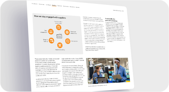 been taken to prevent a reoccurrence. We prohibit retaliation of any kind against supplier employees who participate in our assessments. Our goal is to work together with suppliers to help them improve their management systems, rather than to simply remove them from our supply chain without helping them correct the issues we have discovered. In the event that a supplier is unwilling or unable to improve their operations to meet our requirements, they risk removal from our supply chain. Since 2009, we have directed the removal of 24 manufacturing supplier facilities and 170 smelters and refiners from our supply chain for being unwilling or unable to sufficiently improve their operations to meet our requirements. Results of our assessments are detailed in our People and Environment in Our Supply Chain Report beginning on page 91. A responsibility that grows with our business As Apple’s business continues to grow and expand to new areas, we adapt our supplier engagement model accordingly. This includes continuing to expand our scope to conduct independent, third-party assessments of a growing number of suppliers that support our business outside of manufacturing. Last year, we increased our engagement and expanded the application of our Code and Standards to suppliers supporting newer areas of Apple’s business, including those that work with our content services like Apple TV+ and Apple Fitness+. Supplier employees at Final Assembly in the U.S. How we stay engaged with suppliers widely used by the industry. A total of 99 RBA VAP assessments were completed in fiscal year 2021 at Apple supplier sites. If we uncover non-compliance in the course of any assessment or engagement, we take prompt action so that suppliers not only correct and remedy the issue, but make meaningful, long-term changes to their systems and processes. We do this through a Corrective Action Plan (CAP), during which 30-, 60-, and 90-day check-ins with Apple are required. We then conduct our Corrective Action Verification (CAV) process to verify that all corrective actions have been successfully implemented, and necessary steps have Code of conduct assessments Specialized assessments Investigations Capability building Ongoing training Early engagement These assessments also include unannounced assessments and unannounced visits in response to workers’ grievances and allegations, or to verify risks at supplier facilities based on predictive analytics. In fiscal year 2021, 211 unannounced assessments and investigations were conducted where the supplier facility was provided no advance notice of our arrival. This is nearly double the number conducted in 2020. In addition to third-party Code of Conduct assessments, we require many of our suppliers to also undergo the Responsible Business Alliance’s (RBA) Validated Assessment Program (VAP), a facility-wide, third-party assessment Appendix Governance Communities Suppliers Customers Our People Environment Introduction Apple’s 2022 ESG Report 39
