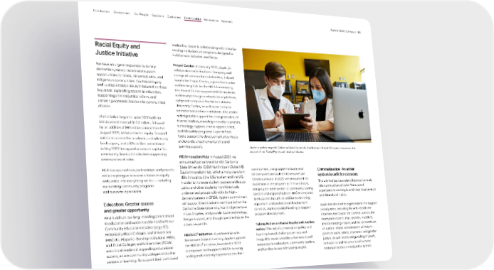 Apple is partnering with California State University, Northridge’s Global HSI Equity Innovation Hub as part of our Racial Equity and Justice Initiative. Racial Equity and Justice Initiative We have an urgent responsibility to help dismantle systemic racism and support opportunities for Black, Hispanic/Latinx, and Indigenous communities. Our Racial Equity and Justice Initiative (REJI) is focused on three key areas: expanding access to education, supporting criminal justice reform, and removing economic barriers for communities of color. The initiative began in June 2020 with an initial commitment of $100 million, followed by an additional $30 million commitment in August 2021, to help elevate equity-focused solutions across the academic and advocacy landscapes, and a $25 million commitment in May 2022 to expand access to capital for community financial institutions supporting communities of color. REJI has spurred new partnerships and projects while inspiring us to weave a focus on equity and justice into everything we do — including our existing community programs and business operations. Education: Greater access and greater opportunity REJI builds on our long-standing commitment to education and works hand in hand with our Community Education Initiative ( page 62 ). Historically Black Colleges and Universities (HBCUs), Hispanic-Serving Institutions (HSIs), and Tribal Colleges and Universities (TCUs) are critical leaders in expanding educational access, as are community colleges and other centers of learning. To support their continued leadership, Apple is collaborating with minority- serving institutions on programs designed to build a more inclusive workforce. Propel Center: In January 2021, Apple, in collaboration with Southern Company and a range of community stakeholders, helped launch the Propel Center, a global innovation and learning hub for the HBCU community. The Propel Center supports HBCU students and faculty through a robust virtual platform, a physical campus in the historic Atlanta University Center, as well as on-campus activations at partner institutions. The center is designed to support the next generation of diverse leaders, providing innovative curricula, technology support, career opportunities, and fellowship programs. Experts from Apple support the development of curricula and provide ongoing mentorship and learning support. HSI Innovation Hub: In August 2021, we announced our partnership with California State University (CSU) Northridge’s Global HSI Equity Innovation Hub, which aims to transform HSIs throughout the CSU system and the U.S. in order to increase student success and equip Latinx and other students from historically underserved groups with skills for high- demand careers in STEM. Apple’s commitment will support the initiative’s main location on the California State University, Northridge campus in Los Angeles, and provide Apple technology, design support, and thought partnership as the project expands. HBCU C 2 Initiative: In partnership with Tennessee State University, Apple supports the HBCU C 2 initiative, launched in 2019 to empower and support HBCUs to bring coding and creativity experiences to their communities, using Apple hardware and its Everyone Can Code and Everyone Can Create curricula. In 2021, we announced the expansion of the program to 11 new schools, bringing the total number of community coding centers and regional hubs on HBCU campuses to 45 across the U.S. In addition to donating equipment and professional development services, Apple provided funding to support program development. Taking Action on Racial Equity and Justice series: This set of conversation guides and learning-based challenges on race and inequality issues provides a framework and resources for educators, community leaders, and families to use with young people. Criminal justice: An unfair system is unfit for everyone The criminal justice system disproportionately fails communities of color. We support organizations working to end mass incarceration and defend civil rights. Apple has donated to organizations that support racial justice, including the Anti-Recidivism Coalition, the Council on Criminal Justice, the Innocence Project, The Last Mile, Recidiviz, The Sentencing Project, and the Vera Institute of Justice. These commitments will help to promote racial, ethnic, economic, and gender justice, as well as the safeguarding of youth, and work to end the practice of extreme sentences in the criminal justice system. Appendix Governance Communities Suppliers Customers Our People Environment Introduction Apple’s 2022 ESG Report 60