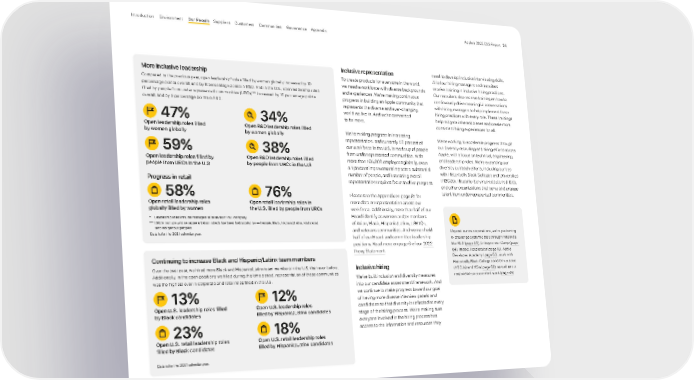 Inclusive representation To create products for everyone in the world, we need a workforce with diverse backgrounds and experiences. We’re making continuous progress in building an Apple community that represents the diverse and ever-changing world we live in. And we’re committed to far more. We’re making progress in increasing representation, and currently 50 percent of our workforce in the U.S. is made up of people from underrepresented communities. With more than 165,000 employees globally, even a 1 percent improvement impacts a substantial number of people, and increasing overall representation requires focus to drive progress. Please see the Appendix on page 81 for more data on representation across our workforce. Additionally, more than half of our Board identify as women and/or members of Asian, Black, Hispanic/Latinx, LGBTQ+, and veterans communities. And women hold half of our Board and committee leadership positions. Read more on page 6 of our 2022 Proxy Statement . Inclusive hiring We’ve built inclusion and diversity measures into our candidate assessment framework. And we continue to make progress toward our goal of having more diverse interview panels and candidates so that diversity is reflected at every stage of the hiring process. We’re making sure everyone involved in the hiring process has access to the information and resources they need to develop inclusive interviewing skills. All of our hiring managers and recruiters receive training in inclusive hiring practices. Our recruiters also receive training on how to continuously drive meaningful conversations with hiring managers to help implement these hiring practices with every role. These trainings help mitigate inherent biases and create more consistent hiring experiences for all. We’re working to accelerate progress through our diversity recruiting and hiring efforts across Apple, with a focus on technical, engineering, and leadership roles. We’re expanding our diversity outreach efforts, including our ties with Historically Black Colleges and Universities (HBCUs), Hispanic-Serving Institutions (HSIs), and other organizations that serve and engage talent from underrepresented communities. Beyond our own operations, we’re partnering to challenge systemic bias through initiatives like REJI ( page 60 ), Entrepreneur Camp ( page 64), Impact Accelerator ( page 18 ), Apple Developer Academy ( page 63 ), work with Historically Black Colleges and Universities (HBCUs) and HSIs ( page 60 ), as well as our responsible procurement work ( page 45 ). Data is for the 2021 calendar year. Continuing to increase Black and Hispanic/Latinx team members Over the past year, we hired more Black and Hispanic/Latinx team members in the U.S. than ever before. Additionally, in the open positions we filled during this time period, representation of these communities was the highest ever in corporate and retail roles filled in the U.S. 13% Open U.S. leadership roles filled by Black candidates 12% Open U.S. leadership roles filled by Hispanic/Latinx candidates 23% Open U.S. retail leadership roles filled by Black candidates 18% Open U.S. retail leadership roles filled by Hispanic/Latinx candidates 47% Open leadership roles filled by women globally 34% Open R&D leadership roles filled by women globally 59% Open leadership roles filled by people from URCs in the U.S 38% Open R&D leadership roles filled by people from URCs in the U.S Progress in retail 58% Open retail leadership roles globally filled by women 76% Open retail leadership roles in the U.S. filled by people from URCs More inclusive leadership Compared to the previous year, open leadership* roles filled by women globally increased by 10 percentage points overall, and by 8 percentage points in R&D. And in the U.S., open leadership roles filled by people from underrepresented communities (URCs)** increased by 16 percentage points overall, and by 9 percentage points in R&D. * Leadership roles include managers at all levels of our company. ** URCs: Groups whose representation in tech has been historically low — Female, Black, Hispanic/Latinx, Multiracial, and Indigenous peoples. Data is for the 2021 calendar year. Appendix Governance Communities Suppliers Customers Our P eople Environment Introduction Apple’s 2022 ESG Report 24