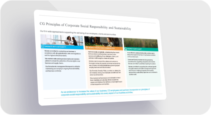 CGPrinciples of Corporate Social Responsibility and Sustainability Ourfirmwideapproachestosupportingthewellbeingofouremployees,clientsandcommunities OPERATEWITHINTEGRITY RESPECTPEOPLEANDCOMMUNITIES RESPECTOURPLANET Wearecommittedtoconductingourbusinessin Wethinklocallyandglobally,understandingtheimpact In our efforts to create enduring value, we take care to accordancewithallapplicablelaws, rulesandregulations thatouractionsandbehavioursmayhaveonthe reducetheimpactofourday-to-daybusinessactivities andthehighestethicalstandards. successandwellbeingofourcolleagues,clients,and ontheenvironment. Wemaintainsafeworkingenvironmentsandmaintain partnersinalltheregionswhereweoperate. CanaccordGenuityhasalsohadalong-standing policies to ensure the protection of human rights in our We takecaretorespectthecultureandcustomsin commitmenttosupportingcompaniesand investors businessandsupplychains. theregionswhereweoperateandwherewetravel.We that are committed to positively impacting the planet. Ourfirmwideriskmanagementframeworkiscriticalto arecompliantwithallapplicablelawsgoverningequal Wearecommittedtosupportingthecontinuedgrowth maintaining ourcompany’songoingfinancialstability employmentandanti-discrimination. ofcapital markets and wealthmanagementsegments andbusinesscontinuity. Our firmwide Diversity Policy is centred on valuing the whichfocusonhelpingcompaniesandinvestors rich diversity among our employees and all those with advancetheirsustainabilityobjectivesandcontributeto whomwedobusiness. abetterworld. Weempowerourbusinessesandindividualstodirect their charitable and volunteer efforts towards the causesandinitiativesthatwillhaveameaningfulimpact in their respective communities. Asweendeavourtoincreasethevalue ofourbusiness,CGemployeesandpartners incorporate our principles of corporatesocialresponsibilityandsustainabilityintoeveryaspectofourbusinessactivities.