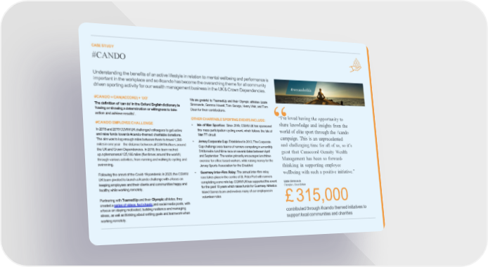 CASESTUDY #CANDO Understandingthebenefitsofanactivelifestyleinrelationtomentalwellbeingandperformanceis importantintheworkplaceandso#candohasbecometheoverarchingthemeforallcommunity drivensportingactivityforourwealthmanagementbusinessintheUK&CrownDependencies. #CANDO=CAN(ACCORD)+‘DO’ We are grateful to TeamedUp and their Olympic athletes Lizzie Thedefinitionof‘cando’intheOxfordEnglishdictionaryis Simmonds, Gemma Howell, Tom George, Henry Weir, and Tom ‘havingorshowinga determinationorwillingnesstotake Deanfortheircontributions. actionandachieveresults’. OTHERCHARITABLESPORTING EVENTSINCLUDE: “I’ve loved having the opportunity to #CANDOEMPLOYEECHALLENGE • Isle of Man Sportive: Since 2019, CGWM UK has sponsored share knowledge and insights from the In 2018 and2019CGWMUKchallengedcolleaguestogetactive this mass participation cycling event, which follows the Isle of “ world of elite sport through the #cando andraise funds towards #cando-themed charitable donations. ManTTcircuit campaign. This is an unprecedented Theaimwastologenoughmilesbetweenthemtotravel1,280 • JerseyCorporateCup:Establishedin2013,TheCorporate and challenging time for all of us, so it’s milesinoneyear–thedistancebetweenallCGWMofficesaround Cupchallengeseesteamsofrunnerscompetinginamonthly theUKandCrownDependencies.In2018,thisteamracked 5-kilometrelunchtimeraceonseveraldatesbetweenApril great that Canaccord Genuity Wealth upaphenomenal125,166miles(fivetimesaroundtheworld!) andSeptember.Theseriesprimarilyencourageslunchtime Management has been so forward- throughvarious activities, from running and walking to cycling and exercise for office based workers, while raising money for the swimming. JerseySportsAssociationfortheDisabled thinking in supporting employee FollowingtheonsetoftheCovid-19pandemicin2020,theCGWM • GuernseyInter-FirmRelay:Theannualinter-firm relay wellbeing with such a positive initiative.” UK teampivotedtolauncha#candochallengewithafocuson racetakesplaceinthecentreofSt.PeterPortwithrunners keepingemployeesandtheirclientsandcommunitieshappyand completingaonemilelap.CGWMUK hassupportedthisevent Lizzie Simmonds healthy while working remotely. for the past 18 years which raises funds for Guernsey Athletics Olympian,GreatBritain Island Gamesteamandinvolvesmanyofouremployeesin Partnering with TeamedUpandtheirOlympicathletes,they volunteerroles £315,000 createdaseriesofvideos,factsheetsandsocialmediaposts,with afocusonstayingmotivated,buildingresilienceandmanaging contributedthrough#candothemedinitiativesto stress, as well as thinking about setting goals and teamwork when workingremotely. supportlocalcommunitiesandcharities