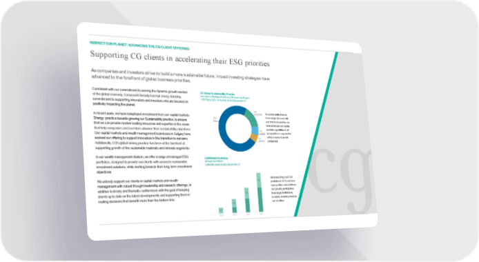 RESPECTOURPLANET:ADVANCINGTHECG CLIENTOFFERING Supporting CG clients in accelerating their ESG priorities Ascompaniesandinvestorsstrivetobuildamoresustainablefuture,impactinvestingstrategieshave advancedtotheforefrontofglobalbusinesspriorities. Consistentwithourcommitmenttoservingthedynamicgrowthsectors CGGlobalSustainability Practice of the global economy, CanaccordGenuityhas hadalong-standing InvestmentBanking& AdvisoryRevenuebyRegion commitmenttosupportinginnovatorsandinvestorswhoare focusedon YTDFiscal2022,9monthsendedDecember31 positively impacting the planet. In recent years, we have redeployed investment from our capital markets As sustainability themes increasingly intersect with Energy practicetowardsgrowingourSustainabilitypractice,toensure ourcorefocussectors,we that wecanprovidemarket-leadingresourcesandexpertiseintheareas haveadvancedourcapital that help companies and investors advance their sustainability objectives. marketscapabilities in all Ourcapital marketsandwealthmanagementbusinessesinCalgaryhave geographies to support the evolvedour offering to support innovators in the transition to net-zero. uniqueneedsofgrowth Additionally, CG’s global mining practice has been at the forefront of companies. supportinggrowthofthesustainablematerialsandmineralssegments. In our wealth managementdivision,weofferarangeofmanagedESG CGWMESGPortfolios portfolios, designed to provide our clients with access to sustainable Annualnetinflows investmentsolutions, while working towards their long-term investment CalendaryearsendedDecember31 objectives. We actively supportourclientsincapitalmarketsandwealth Since launching our ESG managementwithrobustthoughtleadershipand researchofferings,in portfolios in 2018, we have addition to timely and thematic conferences withthegoal of keeping seenpositive annual inflows, and growing participation clients up to date on the latest developments andsupportingthemin fromlargerinstitutional makingdecisions that benefit more than the bottom line. investors, including trustees andcharities.