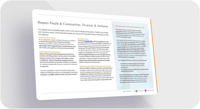 Respect People & Communities: Diversity & Inclusion TheImportanceofDiversity&InclusionatCG AtCanaccordGenuity,weknowthatmanyofourgreatest opportunities arise whenwebringtogetherthediverseand Ourpeopleareourgreatestasset,whichiswhywewillalwaysbefocusedonfosteringadiverse differentiated perspectives from across our talent pool. We strive andinclusiveculture,wheretalentedpeoplecanhaveenrichingexperiencesanddeveloptotheir to operate as an organization that celebrates partnership and is full potential. free from discrimination and bias. CorporateGovernance Diversity Policy OntheinitiativeoftheCEOandtheGlobalOperatingCommittee, AsourCompanyhasevolved,ourBoardofDirectorshascontinued OurfirmwideDiversityPolicy servesasa guidelinetopromote aCoreDiversityCouncilwasestablishedin2016.Itiscomposed to prioritize strong governance and diverse perspectives. equal opportunities for all current and potential CG employees. We of mid- to senior-officer level individuals from each of the regions Beginninginfiscal2022,ourBoardofDirectorshas56%female knowthatdiverseteamscreatebetterbusinessoutcomes, and andreportsregularlytotheChiefExecutiveOfficer.Inconnection representationattheindependentlevel.TheBoardtakesanactive wearecommittedtofosteringan inclusiveenvironmentwhere withthemandateoftheCouncilandontherecommendation role in setting and supporting our Diversity &Inclusion priorities. all employees andclients canthrive, and whereopportunities of the CorporateGovernanceandCompensationCommittee, arebasedonskillandmerit,withoutbias.We havemadesteady theBoardadoptedaformalboarddiversitypolicyfordirectors EqualOpportunityEmployer progressonembeddingthisintoourfirm-widecultureand in connectionwithCanaccordGenuity’sglobaldiversitypolicyin CanaccordGenuitypracticesequalopportunityandfairhiring talent managementprocesses,butwealsorecognizethatthere fiscal 2017 to reflect the Company’s commitment to diversity and processeswhenfillingpositions, andhires only themostqualified is aprofounddifferencebetweenintentionandaction.Weare inclusion throughout its organization. individuals, based on their knowledge, skills, abilities and other committedto continuouseducationandadvancementofthe competencies.CanaccordGenuityhas adoptedthispolicyto policies and processes that address inequality as they relate to In its ManagementInformationCircular, the Companydiscloses: ensurethatall employeesandpotentialcandidatesareconsidered boththeemployeeandclientexperience. • theinitiatives for achieving diversity set by the Board in for employmentopportunitiesthroughaconsistent,fairandbarrier accordancewithourpolicyandtheprogresstowards freeapproach. Listening, Learning and Continuously Improving achieving them; Wearecommittedtocontinuouseducation,andadvancementof Acrosstheorganization,CanaccordGenuityhasimplemented thepolicies and processes that address inequality, as they relate • theproportionoffemaleemployeesatCG,inseniorexecutive policies and measures focused on non-discrimination, harassment to both the employeeandclientexperience. Thepandemichas positionsandontheBoard prevention, accessibility, health and safety, training and education. highlighted the importanceofinclusionandwehavedeployed Several of the existing policies and programs outlined in this report several learning and engagement events to equip leaders and supportDiversityandInclusion,butweknowthatourcollective futureleaderswithtacticsandresourcestohelpusbuildastronger successrequiresustosustainaculturethatwhereeveryone futurewhichincludesadiversepipelineofhigh-potential talent. at CGsharesthisresponsibilityandhasthetoolstoharness opportunities to drive measurable, long-term improvement. SASB: Diversity&Inclusion SDG: 05:GenderEquality | 10: Reduced Inequalities