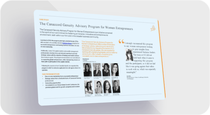 CASESTUDY The Canaccord Genuity Advisory Program for Women Entrepreneurs TheCanaccordGenuityAdvisoryProgramforWomenEntrepreneursisaninitiativeconceived in the spirit of our commitmenttofosteringaninclusive,innovativeandentrepreneurial environment,bothwithinourfirmandinthebroaderbusinesscommunity. Launchedin2019, thisprogrampairshigh-potentialfemaleCEOs “TheCanaccordGenuityAdvisoryProgramfor “I strongly recommend this program withmembersofacarefullyselectedAdvisoryGroupcomprisedof WomenEntrepreneursoffersasolidcombination to any woman entrepreneur looking successful entrepreneurs and leading business innovators, for one- ofstrategicadvice,networkingandmentorship. on-onementorship. We achievethisbyintegratingthetalentsofour “ togaininsightsfrom CanaccordGenuitypeople,whoareexcellentat experienced business leaders. Additionally, senior CG capital markets and wealth management workingwithemergingbusinesses,andourexternal professionals volunteer time and relevant expertise to provide advisorswhoofferawealthofexperienceas The team at CG did not strategicadvicewiththeobjectiveofhelpingeachleaderachieve successful world-class entrepreneurs.” hold back when it came to their business goals. This program demonstrates our commitment DavidKassie to supporting global entrepreneurs, while championing women on Chairman supporting this program their path to participation in the capital markets. CanaccordGenuityGroupInc. and the participants, so it did not feel FollowingthesuccessofourCanadianlaunch,weexpandedthe like it was going against their ethos programin2021towelcomeapplicantsfromallregionswhereCG to work with us, which was especially operates. OUR PROGRAMOFFERS meaningful.” • One-on-onementorshipfromasuccessfulentrepreneur KateBate • Strategic advice from adedicated team of CanaccordGenuity DevonBrooks:CEO& Dr.DinaKulik:Founder Keren Moynihan: Co- SaawanLogan: Co- ManagingDirector/ Partner,Tendril Design &Animation Creator, Sphere &CEO,Kidcrew Founder&CEO,Boss Founder/CEO, North professionals Insights Water 2019Participant. • Networkingopportunities • AninvitationtoourAnnualGlobalGrowthConference,the premiereglobaleventforgrowthcompaniesandinvestors Traci Costa: Founder LucyAylen:CEO, Monica Ruffo: CEO, Katherine Vellinga: CEO,PKBeans NeverFullyDressed WellToldInc. CEO, ZirkovaVodka
