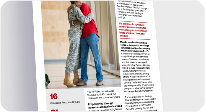 2021 ESG Report Healthy Business third-party experts, the learning and development journey helps participants spot the sources and forms of bias, both in the workplace and in our served communities, and helps equip them to better support stakeholders of all backgrounds. We also extended this work through our philanthropic program offering conscious inclusion training to clinicians in community health settings. We continue to open new lines of communication for our colleagues to exchange ideas and learn from one another. Mosaic, our all-colleague blog series, is designed to encourage conversation within the company around diversity and equity. It’s a space where colleagues from an array of backgrounds can share stories of their lived experiences and their personal journeys of understanding. Topics addressed in 2021 include Hispanic Heritage Month, Walking in Privilege, inclusion and empathy, among others. In 2021, we welcomed all colleagues to attend the annual Diversity Leadership Forum, a two- day enterprise-wide virtual meeting You can learn more about all designed to advance the principles 16 the ways our CRGs benefit our of strategic diversity management. colleagues and our company here. The forum is led by our Strategic Colleague Resource Groups Diversity Management team and the Empowering through Diversity Management Leadership conscious inclusion learning Council, which is CVS Health’s 81 In 2020 we began providing leaders Executive Diversity Council, and with an interactive conscious serves as a group of cross-functional local CRG chapters inclusion learning experience. senior leaders who are accountable We continued the deployment for implementing diversity of conscious inclusion training management in their respective 26K+ for colleagues in 2021 to explore parts of the business. Attendance colleagues participate the impact of unconscious bias topped 1,000 participants, more in at least one CRG and build an understanding of than three times the previous inclusive behaviors. Developed year’s number. in collaboration with leading 33