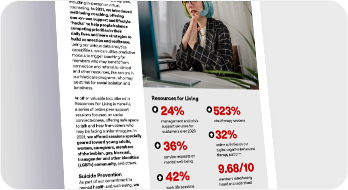 2021 ESG Report Healthy People Resources For Living® Aetna offers personalized mental well-being support to members through Resources For Living, our employee assistance program for plan sponsors. Members can access a range of resources and programs, including in-person or virtual counseling. In 2021, we introduced well-being coaching, offering one-on-one support and lifestyle “hacks” to help people balance competing priorities in their daily lives and learn strategies to build connection and resilience. Using our unique data analytics capabilities, we can utilize predictive models to trigger coaching for members who may benefit from connection and referral to clinical and other resources, like seniors in our Medicare programs, who may be at risk for social isolation and loneliness. Another valuable tool offered in Resources for Living Resources For Living is Here4U, a series of online peer support 24% 523% sessions focused on social connectedness, offering safe space management and crisis chat therapy sessions to talk and hear from others who support services for may be facing similar struggles. In customers over 2020 2021, we offered sessions specially 32% geared toward young adults, women, caregivers, members 36% online activities on our of the lesbian, gay, bisexual, digital cognitive behavioral transgender and other identities service requests on therapy platform (LGBT+) community, and others. mental well-being Suicide Prevention 9.68/10 As part of our commitment to 42% mental health and well-being, we members rated feeling have deployed a comprehensive work life sessions heard and understood strategy to reduce suicide attempts by 20 percent among our Aetna members by the year 33% 9.4% 2025. In 2021, we demonstrated a 15 percent decrease in adult- counseling sessions improvement in well-being member suicide attempts. It for members who reported begins with implementing universal with moderate or severe screening for all members in distress at the initial session behavioral health and employee 22