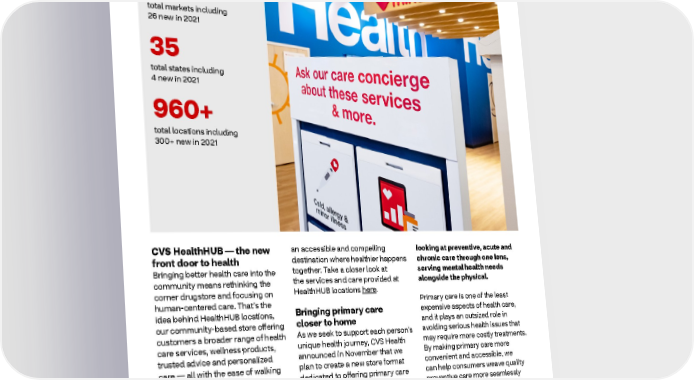 2021 ESG Report Healthy People HealthHUB 2021 Growth 80 total markets including 26 new in 2021 35 total states including 4 new in 2021 960+ total locations including 300+ new in 2021 CVS HealthHUB — the new an accessible and compelling looking at preventive, acute and front door to health destination where healthier happens chronic care through one lens, Bringing better health care into the together. Take a closer look at serving mental health needs community means rethinking the the services and care provided at alongside the physical. corner drugstore and focusing on HealthHUB locations here. human-centered care. That’s the Primary care is one of the least idea behind HealthHUB locations, Bringing primary care expensive aspects of health care, our community-based store offering closer to home and it plays an outsized role in customers a broader range of health As we seek to support each person’s avoiding serious health issues that care services, wellness products, unique health journey, CVS Health may require more costly treatments. trusted advice and personalized announced in November that we By making primary care more care — all with the ease of walking plan to create a new store format convenient and accessible, we right into a local CVS Pharmacy. dedicated to offering primary care can help consumers weave quality services. These neighborhood preventive care more seamlessly In 2021, we expanded the clinics will be the home of physician- into their day-to-day lives and help range of available offerings to led care teams, including nurse reduce the potential for expensive include several health services practitioners, social workers, health interventions in the future. traditionally found in primary pharmacists and others — many of care settings, like chronic care whom are already under our roof. management and behavioral Our coordinated care model will health. With so much under one bring our holistic, consumer- roof, HealthHUB locations provide centric care approach to life — 10