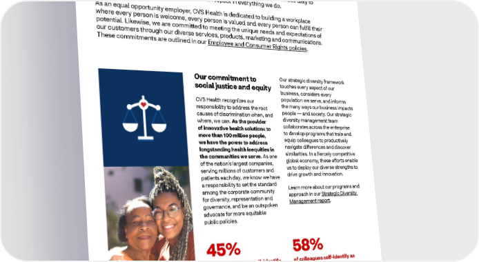 2021 ESG Report Healthy Business Diversity, Equity, Inclusion and Social Justice Our diverse workforce is our company’s greatest strength. It reflects the communities we serve and brings unique ideas, experiences and skills that are necessary to fulfill our purpose. Together, approximately 300,000 CVS Health colleagues join forces daily to uphold our shared commitment of mutual respect in everything we do. As an equal opportunity employer, CVS Health is dedicated to building a workplace where every person is welcome, every person is valued and every person can fulfill their potential. Likewise, we are committed to meeting the unique needs and expectations of our customers through our diverse services, products, marketing and communications. These commitments are outlined in our Employee and Consumer Rights policies. Our commitment to Our strategic diversity framework social justice and equity touches every aspect of our business, considers every CVS Health recognizes our population we serve, and informs responsibility to address the root the many ways our business impacts causes of discrimination when, and people — and society. Our strategic where, we can. As the provider diversity management team of innovative health solutions to collaborates across the enterprise more than 100 million people, to develop programs that train and we have the power to address equip colleagues to productively longstanding health inequities in navigate differences and discover the communities we serve. As one similarities. In a fiercely competitive of the nation’s largest companies, global economy, these efforts enable serving millions of customers and us to deploy our diverse strengths to patients each day, we know we have drive growth and innovation. a responsibility to set the standard Learn more about our programs and among the corporate community approach in our Strategic Diversity for diversity, representation and Management report. governance, and be an outspoken advocate for more equitable public policies. 45% 58% of our pharmacists self-identify of colleagues self-identify as as racially or ethnically diverse racially or ethnically diverse compared to 34% national average 70%+ of CVS Health colleagues self-identify as female 29