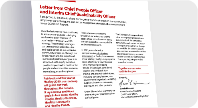 2021 ESG Report Letter from Chief People Officer and Interim Chief Sustainability Officer I am proud to be able to share our ongoing work to strengthen our communities, empower our colleagues, and act as exceptional stewards of our environment in our 2021 ESG Report. Over the last year we have continued These pillars encompass the This ESG report, the appendix and to advance our purpose — bringing breadth of our enterprise and the other accompanying materials aim our heart to every moment of scope of our commitment to doing to succinctly tell the story of the your health — through our ESG our part to create a more equitable remarkable work carried out by our strategy. That strategy leverages and sustainable world. colleagues and partners to change our unmatched capabilities, size our world for the better in 2021. It and scale as well as our expansive In 2021, we undertook a also keeps us accountable to all the community presence. Through our comprehensive prioritization stakeholders who rely on us and broad reach and the expertise of assessment of the topics addressed enable us to set our sights so high. our trusted partners, our goal is to in our strategy to align our programs Thank you for joining us on this advance health equity to make a more effectively to key indicators incredible journey. positive impact on the health of the while monitoring emerging people and communities we serve, trends. This analysis considered Together we can make our colleagues and our planet. insights and feedback from healthier happen. internal and external stakeholders, Reintroduced this year as including company leaders, non- Sincerely, Healthy 2030, our roadmap governmental organizations (NGOs), will guide our work suppliers, investors, customers, throughout the decade. colleagues and other partners. It lays out our ambitious Under this updated alignment, we Laurie Havanec goals in four areas: Healthy are tracking our progress against Executive Vice President, People, Healthy Business, our bold goals. Chief People Officer, Healthy Community Interim Chief Sustainability Officer and Healthy Planet. 4
