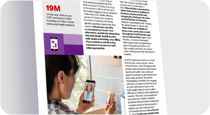2021 ESG Report Healthy People Virtual care — face-to-face If MinuteClinic patients are unable from anywhere to visit a physical MinuteClinic Seeing a doctor, nurse or therapist location, they can opt for either 157K in person can be difficult for an E-Clinic visit with a local people without easy access to MinuteClinic provider or a Virtual MinuteClinic Virtual Care transportation or those living in Visit with a board-certified health visits in 2021 rural areas long distances from care provider in their state. In their providers. Finding time to go 2021, MinuteClinic expanded the to the doctor’s office can be hard Video Visit service to patients in 19M for people juggling a busy schedule. Montana, Alaska and Nevada, That’s why CVS Health offers a bringing the offering to 49 states virtual care visits across variety of virtual care solutions and the District of Columbia. CVS® and Aetna in 2021, focused on helping individuals Offered in partnership with Teladoc, including 10 million virtual get the care they need when they the global leader in virtual care, behavioral health sessions need it. Virtual care can offer Video Visits are available 24 a convenient and lower-cost hours a day, seven days a week alternative, seamlessly integrating through the CVS Pharmacy app into individuals’ health journey and on MinuteClinic.com. These with simple scheduling, easy filling flexible, convenient telehealth of prescriptions and directing offerings provide our patients the consumers to in-person visits same personal connection and when appropriate. high-quality care they can expect when visiting a physical MinuteClinic location. In 2021, Aetna launched our virtual- first primary care program. Aetna Virtual Primary Care reimagines the primary care experience and lowers barriers to health care, making it easier for people to get the services they need, anytime, anywhere. Participating members can engage with their providers online first and are then directed to lower-cost, high-quality sites of care or other effective in-network care settings as needed. This new care experience is powered by Teladoc Health’s physician-led care team model and complemented by the strength of Aetna’s provider network and CVS Health services. It’s a first-of- its-kind health care solution that provides a simple, affordable and convenient way for members to receive quality primary care from a team of providers that knows them and is accessible from just about anywhere. 13