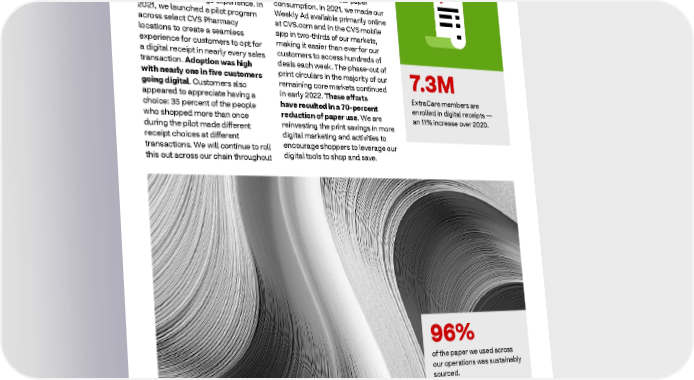 2021 ESG Report Healthy Planet Optimizing digital solutions 2022 as well as offer shorter receipts to reduce paper for customers who chose a printed Our customers are more digitally receipt. engaged than ever, and we’re focused on meeting them where Print circulars have also been a they are and providing a convenient significant source of our paper shopping and savings experience. In consumption. In 2021, we made our 2021, we launched a pilot program Weekly Ad available primarily online across select CVS Pharmacy at CVS.com and in the CVS mobile locations to create a seamless app in two-thirds of our markets, experience for customers to opt for making it easier than ever for our a digital receipt in nearly every sales customers to access hundreds of transaction. Adoption was high deals each week. The phase-out of with nearly one in five customers print circulars in the majority of our 7.3M going digital. Customers also remaining core markets continued appeared to appreciate having a in early 2022. These efforts ExtraCare members are choice: 35 percent of the people have resulted in a 70-percent enrolled in digital receipts — who shopped more than once reduction of paper use. We are an 11% increase over 2020. during the pilot made different reinvesting the print savings in more receipt choices at different digital marketing and activities to transactions. We will continue to roll encourage shoppers to leverage our this out across our chain throughout digital tools to shop and save. 96% of the paper we used across our operations was sustainably sourced. 70% Phase-out of print circulars have resulted in a 70% reduction of paper use. 60