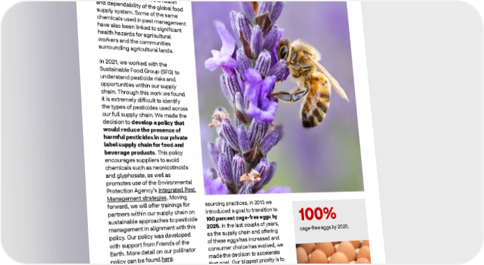 2021 ESG Report Healthy Planet Protecting pollinators The widespread use of pesticides and the degradation of habitat has caused steep declines in populations of pollinators — the birds, bats, insects and especially bees that are so vital to the health and dependability of the global food supply system. Some of the same chemicals used in pest management have also been linked to significant health hazards for agricultural workers and the communities surrounding agricultural lands. In 2021, we worked with the Sustainable Food Group (SFG) to understand pesticide risks and opportunities within our supply chain. Through this work we found it is extremely difficult to identify the types of pesticides used across our full supply chain. We made the decision to develop a policy that would reduce the presence of harmful pesticides in our private label supply chain for food and beverage products. This policy encourages suppliers to avoid chemicals such as neonicotinoids and glyphosate, as well as promotes use of the Environmental Protection Agency’s Integrated Pest Management strategies. Moving forward, we will offer trainings for sourcing practices, in 2015 we partners within our supply chain on introduced a goal to transition to sustainable approaches to pesticide 100 percent cage-free eggs by 100% management in alignment with this 2025. In the last couple of years, policy. Our policy was developed as the supply chain and offering cage-free eggs by 2025. with support from Friends of the of these eggs has increased and Earth. More detail on our pollinator consumer choice has evolved, we policy can be found here. made the decision to accelerate that goal. Our biggest priority is to Animal welfare ensure continued access to healthy CVS Health does not test any store foods at an affordable price. We are brand products on animals as part of currently working with our suppliers our product development process, to expand our selection of cage-free nor do we outsource this activity and free-range eggs in all our stores to any third parties. We’re proud to with a goal to achieve our goal of offer a number of cruelty-free make- 100 percent cage-free eggs by the up and skin care products. As part end of 2022. of our commitment to sustainable 67